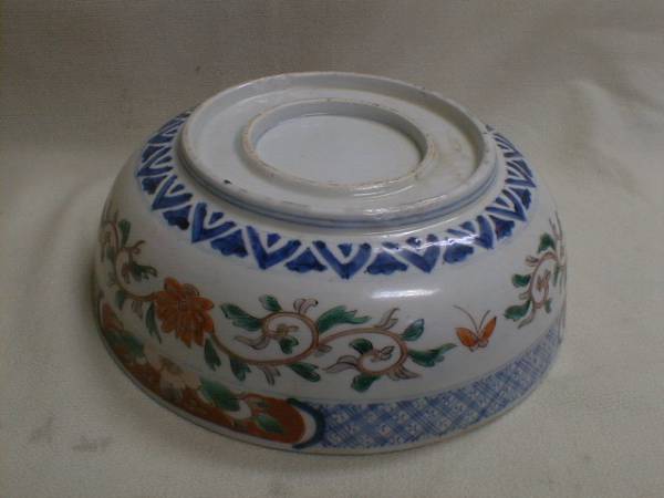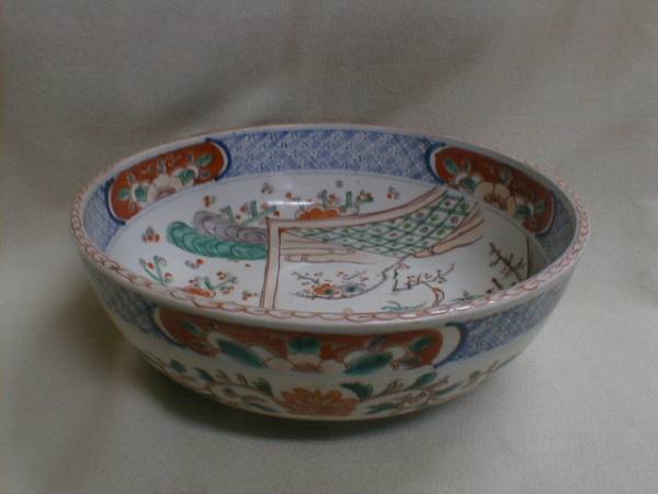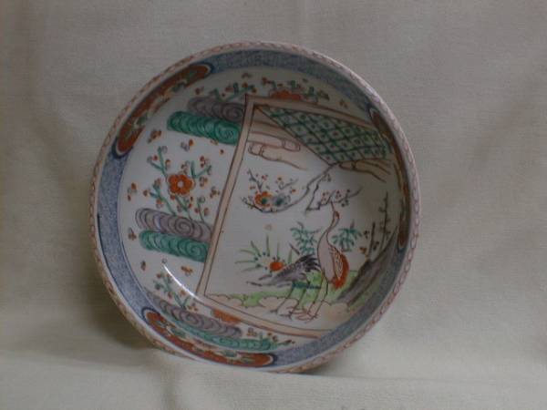 古伊万里 鶴 梅花 鮮やか色絵 8x24.7cm 骨董 明治初期 中鉢