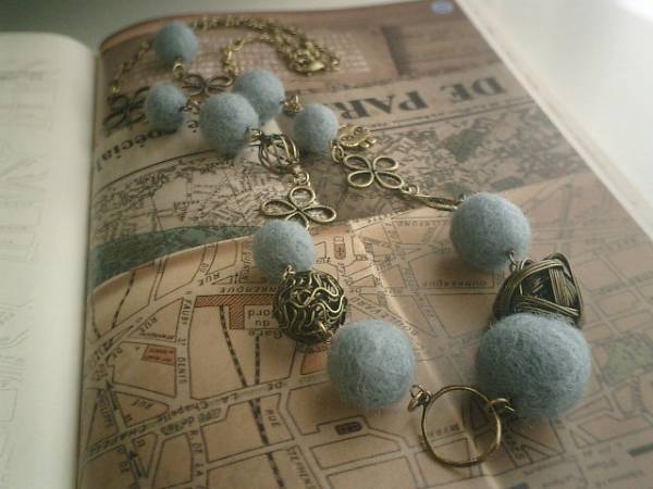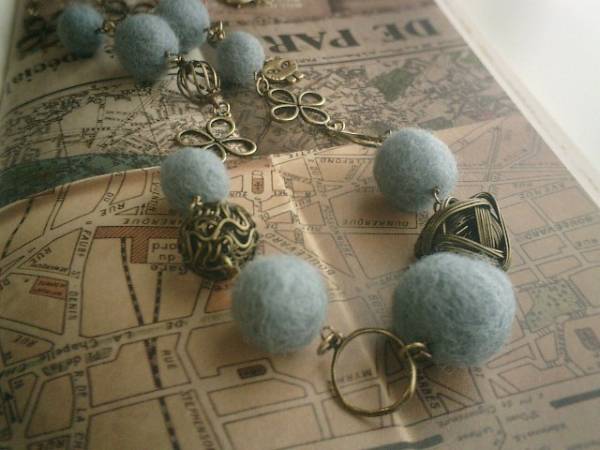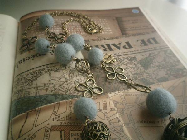 フラッパーガール・・シリーズです♪愛しい人・・ふんわりやさしいフェルト玉のネックレスです♪シックなブルーグレーのフェルト玉は15ミリから22ミリ位までの大きさ違いです♪キュートなクローバーなどデザイン違いのメタルチャームを合わせて可憐な表情です♪長さは全長81センチ位で調節自由です♪お揃いのブレスレットやイヤリングも出品しています♪シンプルで飽きのこないいつまでも着けられるデザインを考えて作りました!ハンドメイドをご理解頂いてノークレーム、ノーリターンでお願いします
