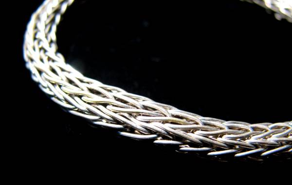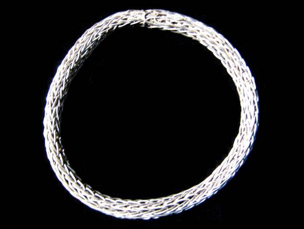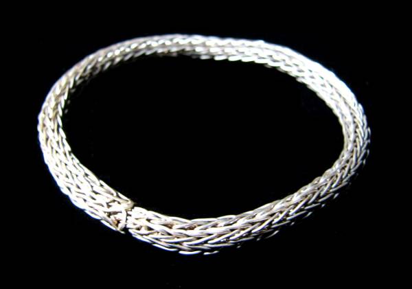 インドネシアの最南端に位置するロテ(Rote)島。棕櫚椰子の葉で作った楽器ササンドゥで世界的に知られる小島です。ロテ島は、ティモール島の南西に浮かびます。そのロテ島の更に西方沖合いにあるのが、とても小さなダオ(Ndao)島。およそ一千世帯が暮らしています。この島は、イカット(絣織り)と銀細工で知られています。このダオ島でのみ作られる銀製品は、ロテ島住民特に女性たちにとって、欠くことのできないアクセサリーです。というのも、盛装の際、そして伝統舞踊衣装に必ず着けなければならないからです。このブレスレットは地元では“カナウ(Kanau)”と呼ばれています。なんでも銀の含有量はおよそ60%で、残りは銅やその他の金属を混ぜているそうです。すべて手作りです。純銀製品は酸化して黒くなりがちですが、ダオ島の銀製品はいつまでも光沢を失いません。細いワイヤを編みこんで縄のような構造です。バリ島やジャワ島の銀細工職人が真似て製造を試みても、どうしても作れないとの逸話さえある、本当に高度な技術を駆使したものです。サイズは、外径がおよそ7cm。太さは約0.6cm。重さは約16グラム。