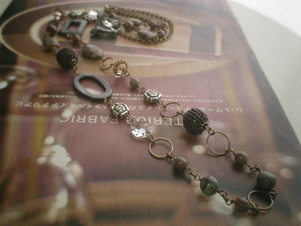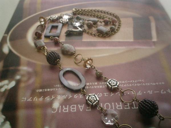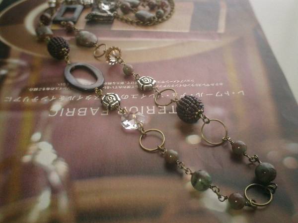 センチメンタル気分・・シリーズです♪秘めた想い・・可憐な薔薇のデザインチャームとグリーンガーネットのネックレスです♪マットなお色でまとめてキュートモダンしています♪30×20ミリ、17×25ミリのシェルリングや13ミリのマットパープルのビーズ玉、14ミリのスワロのヘキサゴン、アンティークビーズなど個性的な素材に6ミリ、8ミリの丸玉や大きさ違いのフラットオーバルのグリーンガーネットを合わせて大人のロマンチックしています♪♪長さは全長95センチ位で調節自由です♪2連にされても可愛いです♪お揃いのブレスレットも出品しています♪シンプルで飽きのこないいつまでも着けられるデザインを考えて作りました!ハンドメイドをご理解頂いてノークレーム、ノーリターンでお願いします