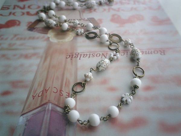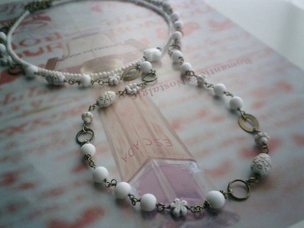 アート・ロマン主義・・シリーズです♪ベネチアに恋して・・やさしい白でまとめたネックレス2点セットです♪お揃いで着けても単品でも楽しんでいただけます♪♪どちらもオフ・ホワイトでまとめてふんわりやさしい表情です♪シンプルなデザインは3ミリのホワイト・ジェードの丸玉に15ミリのクロスカットのホワイトオニキスを合わせました♪長さは40センチ+アジャスター14センチで最長54センチ位です♪長い方のネックレスは8ミリの丸玉の樹脂ビーズにチェコのデザインビーズやベネチアンビーズやメタルリングを合わせてひっそり可憐な表情です♪長さは全長100センチ位で調節自由です♪2連にされても可愛いです♪それぞれ単品やお揃いのブレスレットも出品しています♪シンプルで飽きのこないいつまでも着けられるデザインを考えて作りました!ハンドメイドをご理解頂いてノークレーム、ノーリターンでお願いします