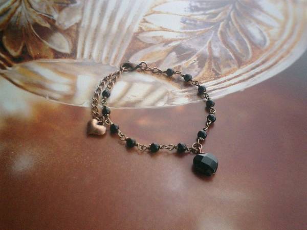 アート・ロマン主義・・シリーズです♪可憐な黒を集めて・・シックなオニキスのブレスレットです♪大人仕様のデザインです♪4ミリの黒の丸玉のオニキスにトップは10ミリのカットハートのオニキスです♪長さは全長23センチ位で調節自由です♪♪お揃いのブレスレットやネックレスやイヤリングも出品しています♪♪シンプルで飽きのこないいつまでも着けられるデザインを考えて作りました!ハンドメイドをご理解頂いてノークレーム、ノーリターンでお願いします