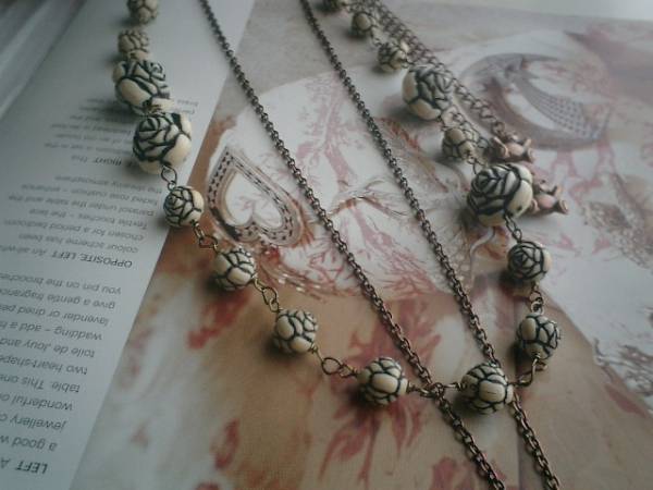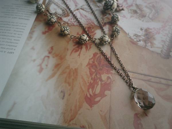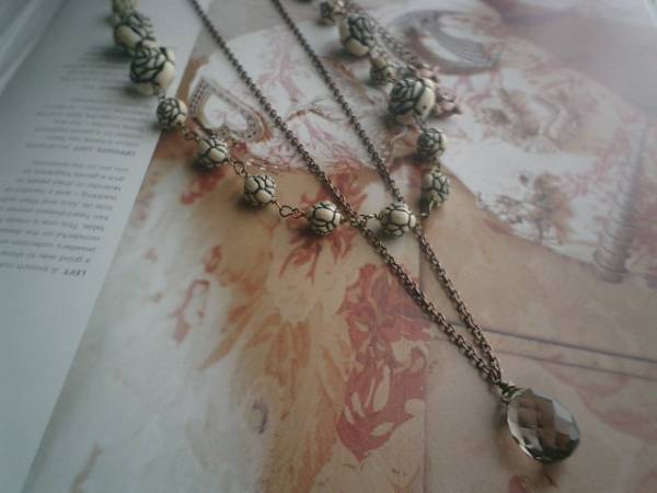 私的・乙女心・・シリーズです♪アンニュイな薔薇・・シックな薔薇とスモーキークォーツのネックレス2本セットです♪甘すぎない大人のロマンチックしています♪アイボリーホワイトの樹脂薔薇は10ミリと14ミリ位の大きさ違いです♪キュートな表情のネックレスです♪長さは全長74センチ位で調節自由です♪チョーカー風にされても可愛いです♪繊細なスモーキークォーツは13×18ミリ位のドロップカットです♪長さは84センチ+アジャスター12センチで最長96センチ位です♪それぞれ単品でも出品しています♪お揃いのブレスレットも出品しています♪シンプルでいつまでも着けられるデザインを考えて作りました!ハンドメイドをご理解頂いてノークレーム、ノーリターンでお願いします