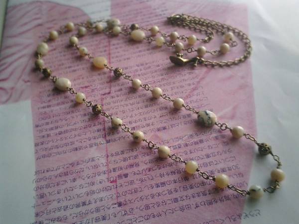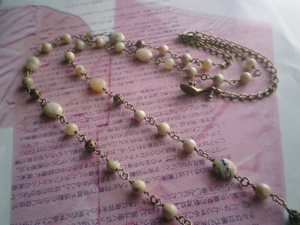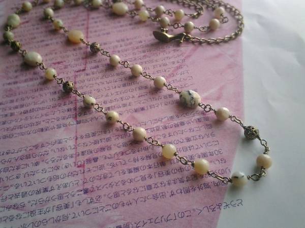 ニューヨーク・デッサンシリーズです♪ナチュラルスタイル・・やさしい表情のアフリカンオパールのネックレスです♪シックなお色でまとめて大人のロマンチックしています♪6ミリの丸玉、10×8ミリのオーバルのアフリカンオパールに透かしメタルチャームを合わせて可憐な表情です♪長さは全長90センチ位で調節自由です♪2連にされてもブレスにされても可愛いです♪お揃いのネックレスやブレスレットも出品しています♪シンプルで飽きのこないいつまでも着けられるデザインを考えて作りました!ハンドメイドをご理解頂いてノークレーム、ノーリターンでお願いします