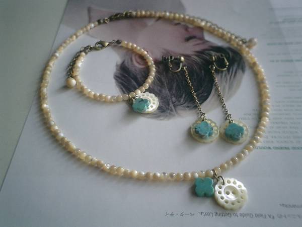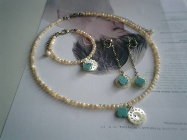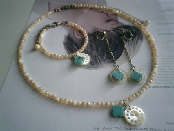 ベーシック・スタイル・・シリーズです♪シックな初夏をイメージしてマザーオブパールとターコイズのネックレス、ブレスレット、イヤリングの3点セットです♪イヤリングはピアスにも変更出来ます♪3ミリの丸玉のマザーオブパールはシックなベージュ色です♪10ミリのフラワーカットのターコイズとレース模様の透かしシェルを合わせて可憐な表情です♪ネックレスは45センチ+アジャスター13センチで最長58センチ位です♪ブレスレットは16センチ+アジャスター6センチで最長22センチ位です♪イヤリングは7センチ位です♪それぞれ単品でも出品しています♪♪シンプルで飽きのこないいつまでも着けられるデザインを考えて作りました!ハンドメイドをご理解いただいてノークレーム、ノーリターンでお願いします
