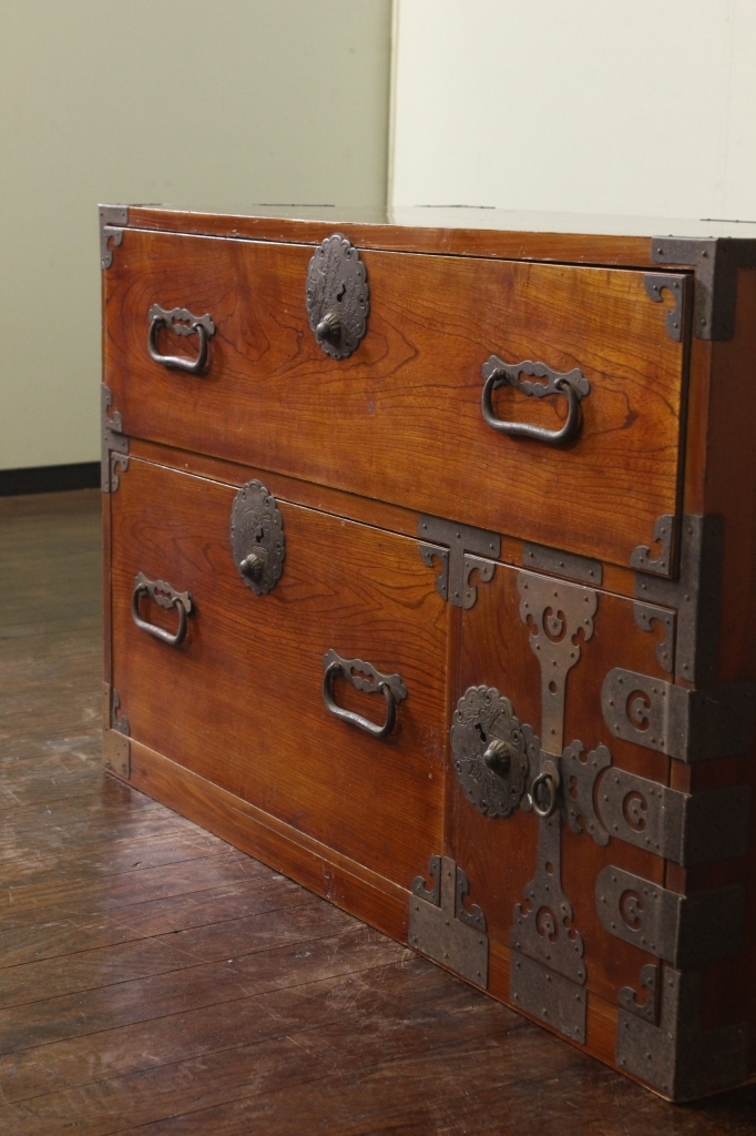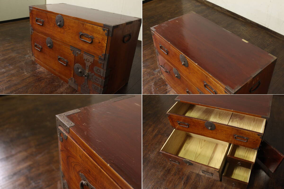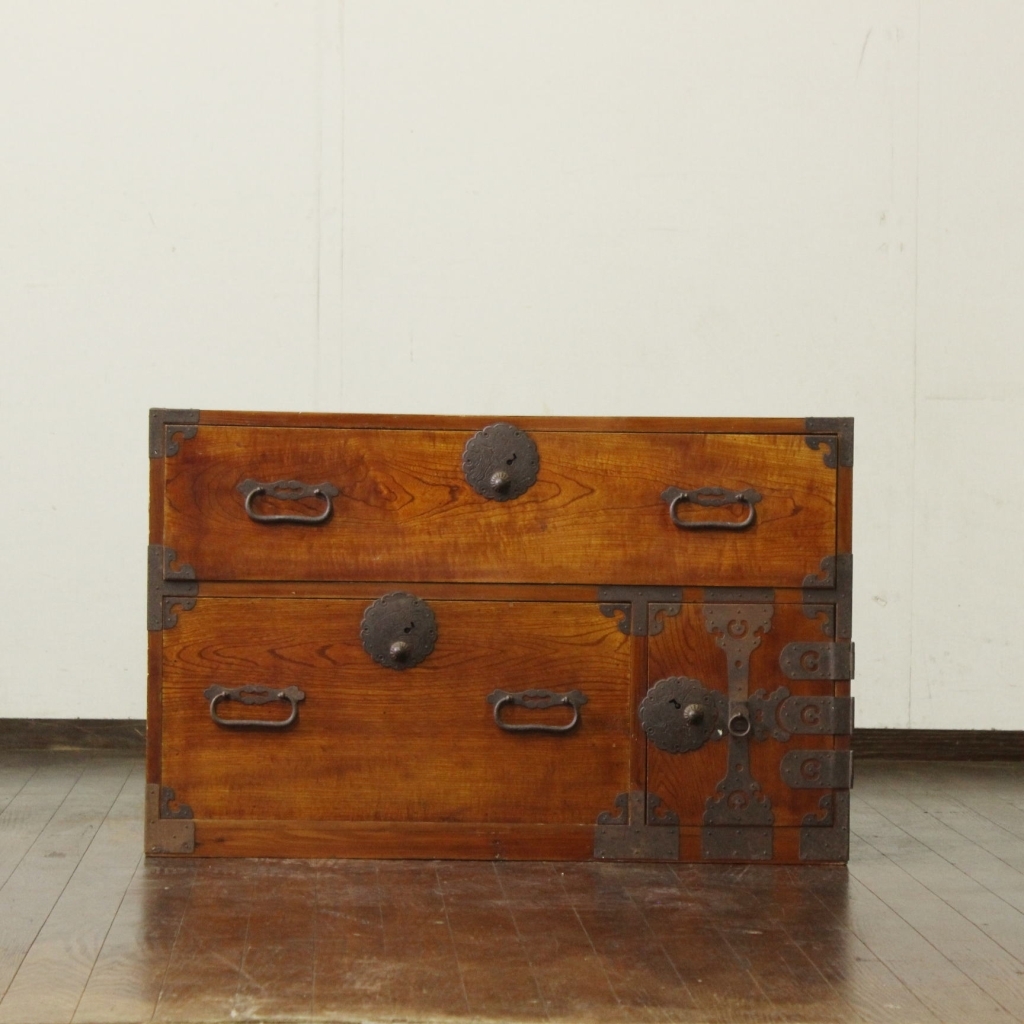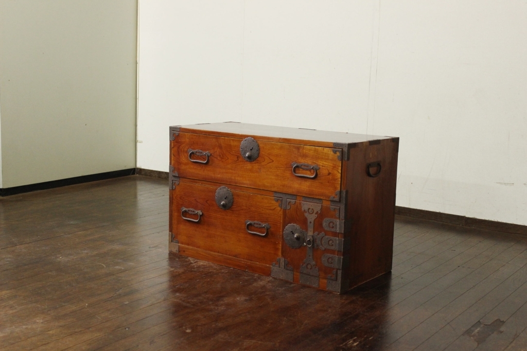 | 商品紹介 | 古い庄内地方の衣装箪笥です。 おそら昭和初期頃からのものではないしょうか。 引き出し前板は杢模様の良い欅材の突板張り、 扉付き四杯の引出しレイアウト。 軍配型の引手や重厚な錠金具も素敵です。 和レトロなアイテムとしては実用は勿論、 ディスプレイなどインテリアにもオススメです。 |