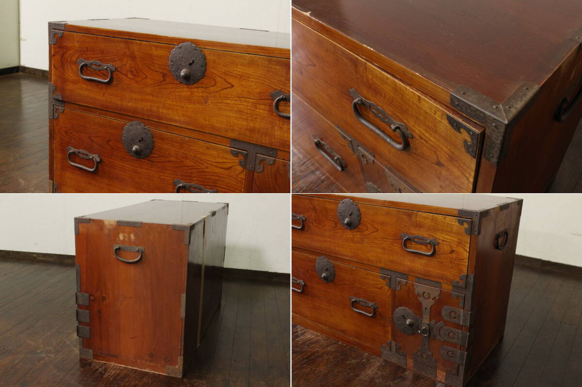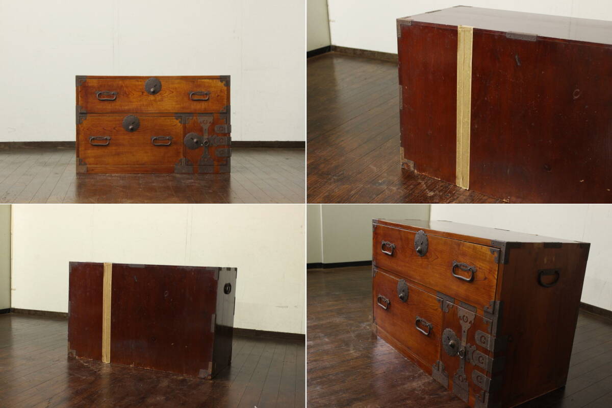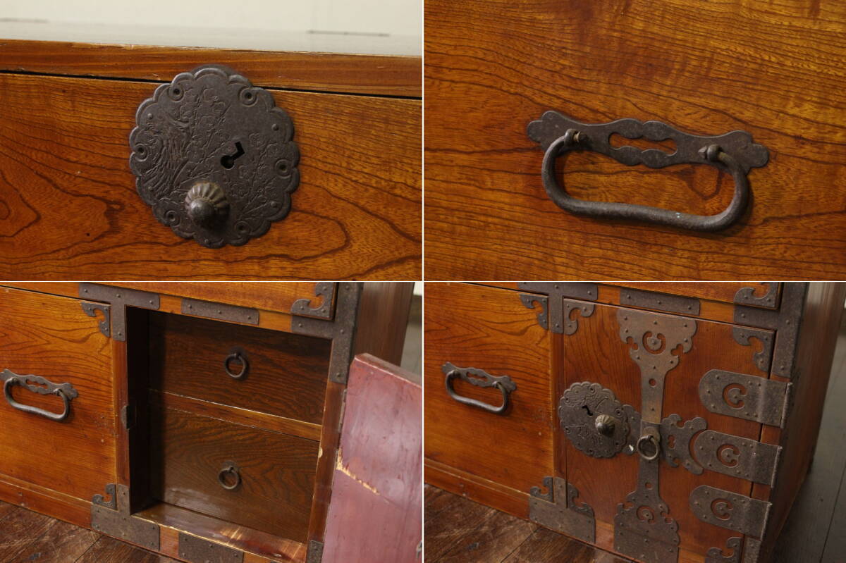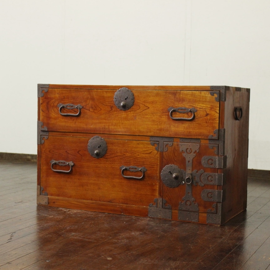| 商品紹介 | 古い庄内地方の衣装箪笥です。 おそら昭和初期頃からのものではないしょうか。 引き出し前板は杢模様の良い欅材の突板張り、 扉付き四杯の引出しレイアウト。 軍配型の引手や重厚な錠金具も素敵です。 和レトロなアイテムとしては実用は勿論、 ディスプレイなどインテリアにもオススメです。 |