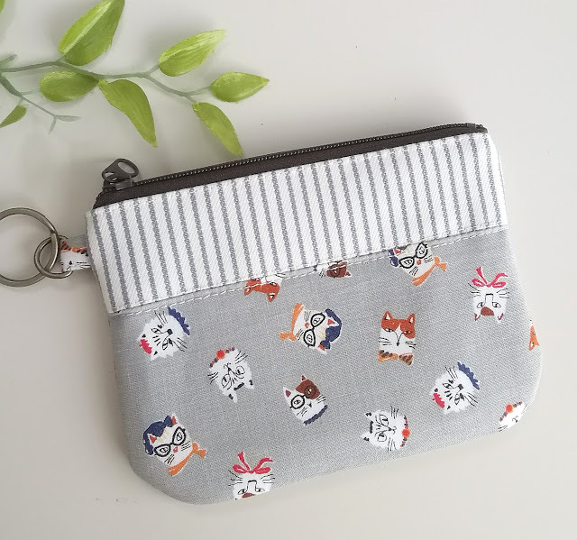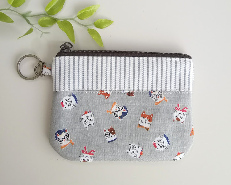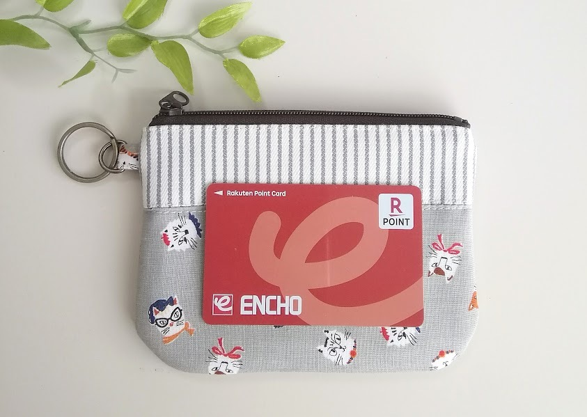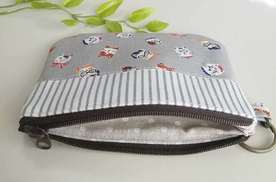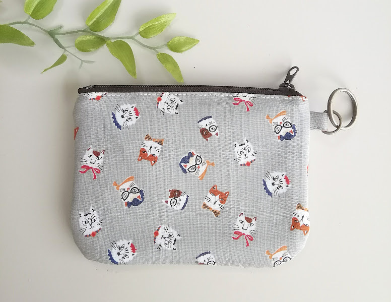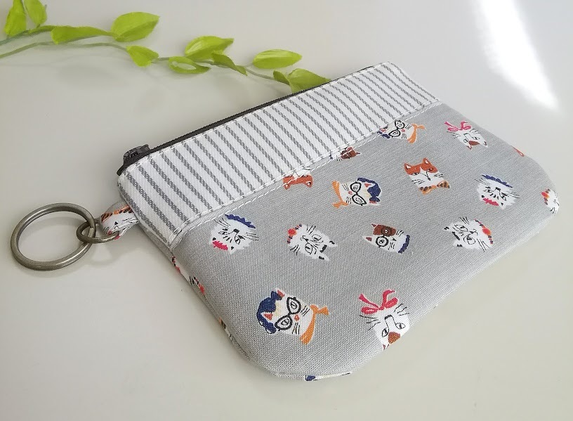 ハンドメイド〈キーリング付き〉フラットポーチ  おしゃれキャット*猫柄〈13×9.5〉.