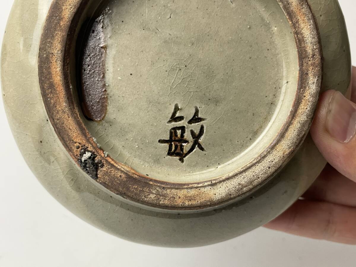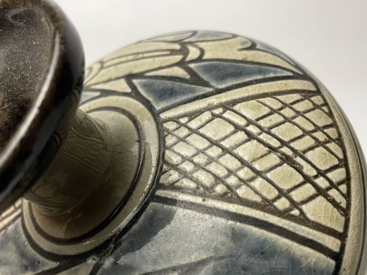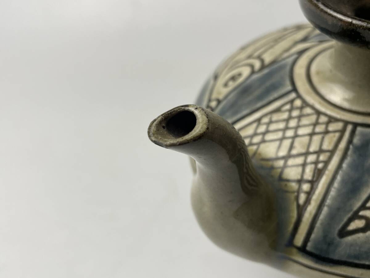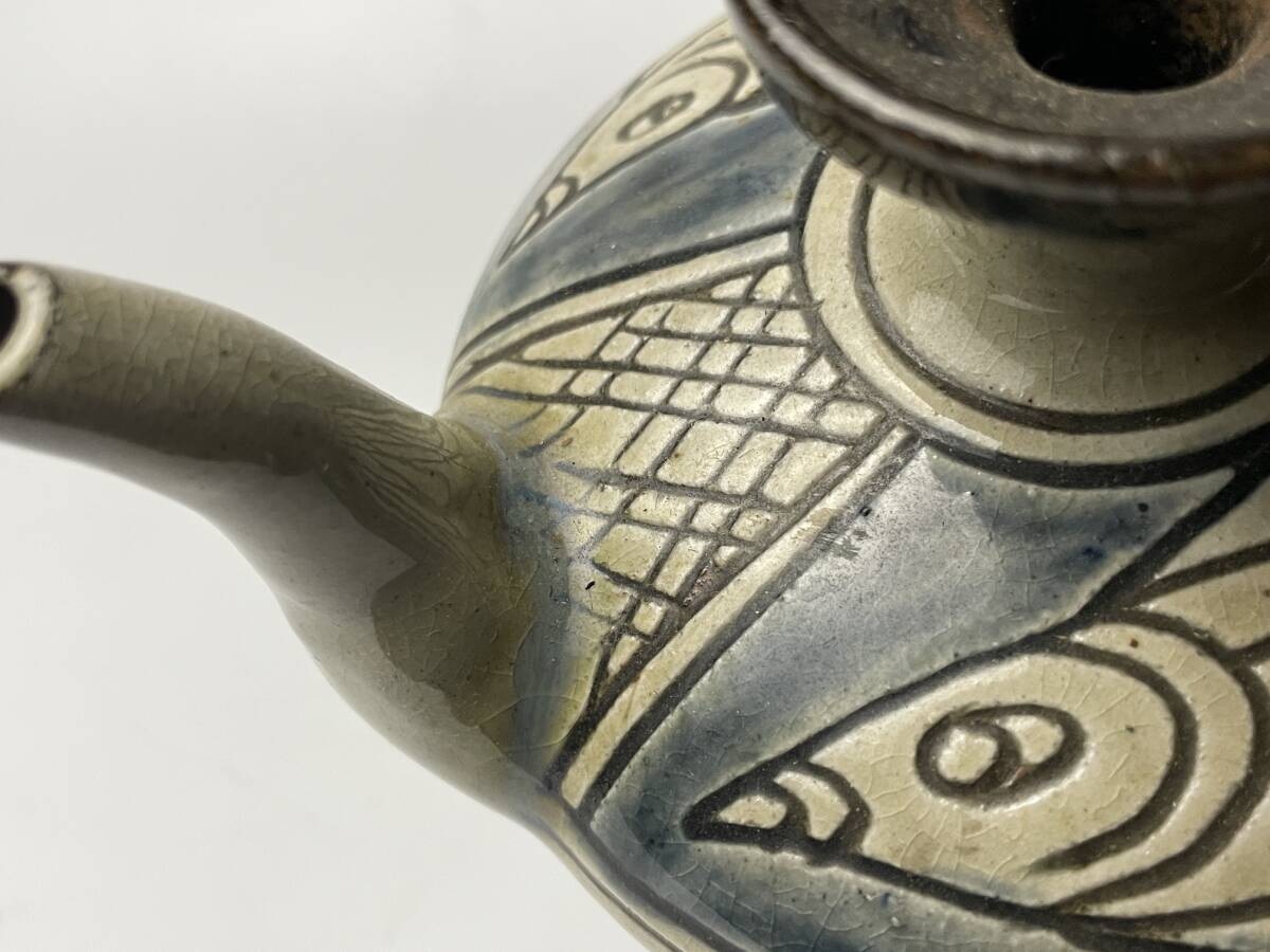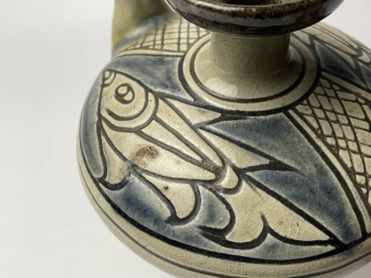 | 【金城敏男】 壺屋焼 水注 魚文 酒器 急須 琉球 敏銘 高さ約10cm |