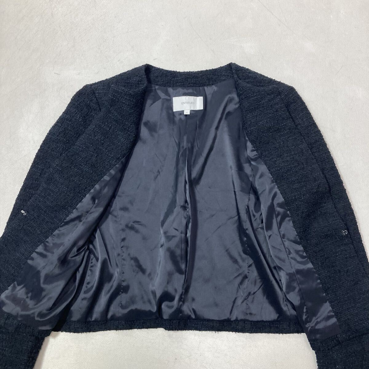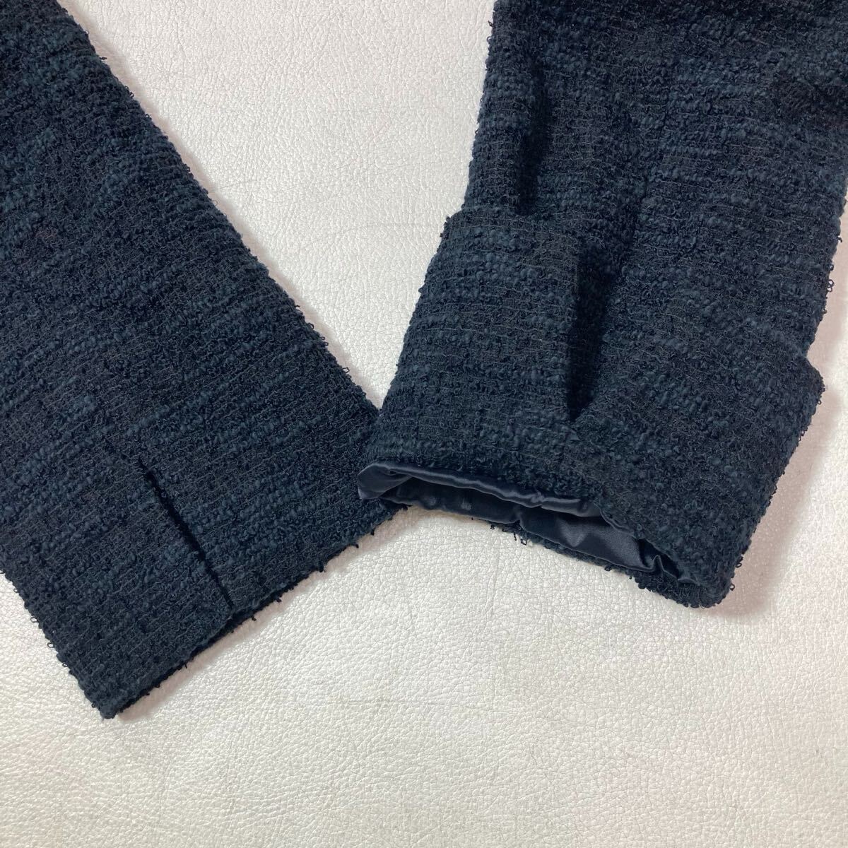 【デザイン】ノーカラーのホック留めジャケット。顔周りをシャープに引き立てるVラインがポイントです。ベーシックな長袖で、3シーズン活躍するのが◎脚長見せの期待できるショート丈。【生地感】 起毛立たせてふっくらと仕上げたツイードマテリアルを使った着心地のよい1枚。