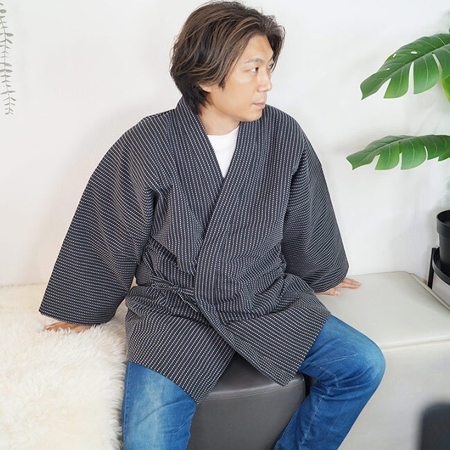 【ひめか】はんてん メンズ 日本製 どてら 刺し子 作務衣式 打ち合わせ 綿入り半天 キルト 2035 半纏 半てん 袢纏 男性用 丹前 中綿 冬 黒