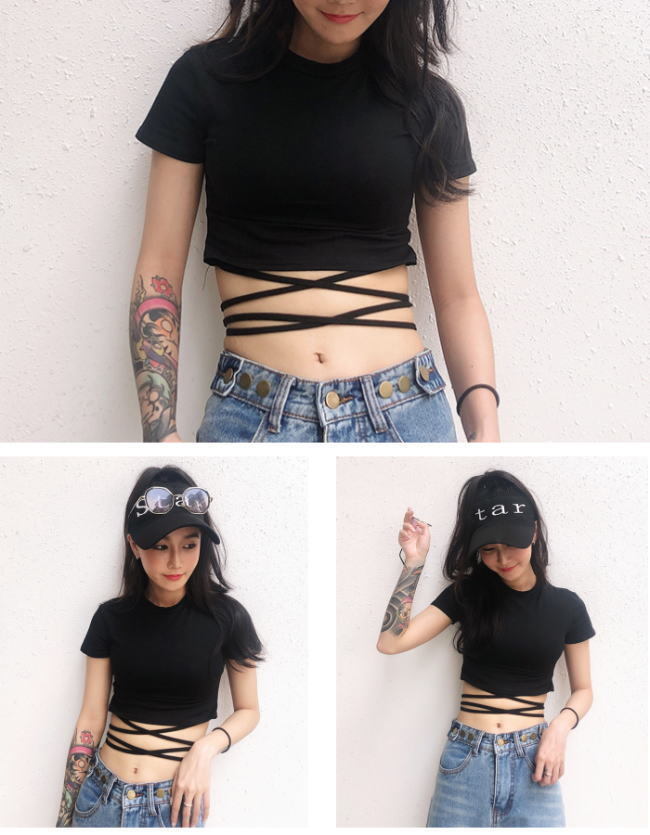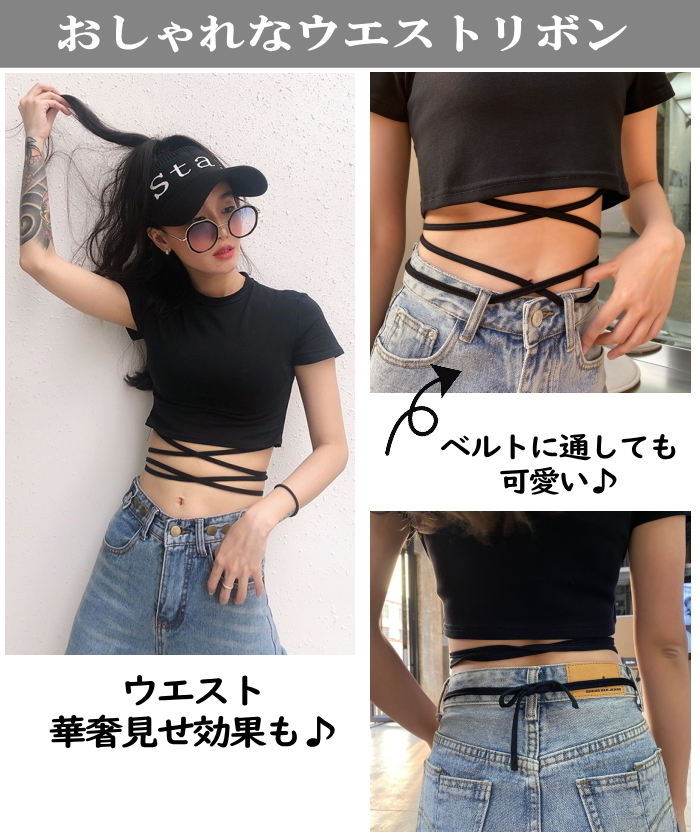 ショート丈 Tシャツトップス【黒-s】半袖 へそ出し キッズ スポーツウェア ダンス 衣装 着痩せ 韓国 おしゃれ 編み上げ cy240n-p0