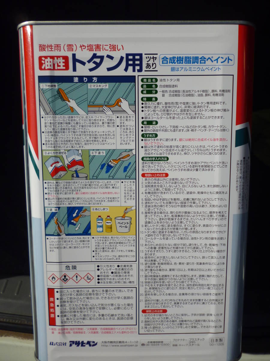●乾燥時間:夏期/5~8時間、冬期/12~20時間●標準塗り面積(1回塗り):77~98平米(タタミ46~59枚分)● 耐久性にすぐれ、酸性雨(雪)や塩害に強いトタン専用塗料です。 ● 簡単に塗れ、大変伸びがよく、非常に経済的です。 ● トタン板への密着がよく、温度変化によるトタン板の伸び縮みによっても、ひび割れやはがれを生じません。 ● 消防法の非危険物です。【注意事項】●うすめ方:塗りにくいときはペイントうすめ液または合成ボイル油(10%〜15%)でうすめて下さい。※銀はうすめずに塗って下さい。●乾燥時間:夏期/5〜8時間(銀は3〜5時間) 冬期/12〜20時間(銀は6〜10時間) 塗り重ね時間の目安:夏期/1日以上 冬期/2日以上●標準塗り面積:【1回塗り 一般色(銀以外)】 0.7L:8.0〜10平米 (タタミ4.8〜6枚分) /1.8L:20〜25平米 (タタミ12〜15枚分) 7L:77〜98平米 (タタミ46〜59枚分) /14L:154〜196平米