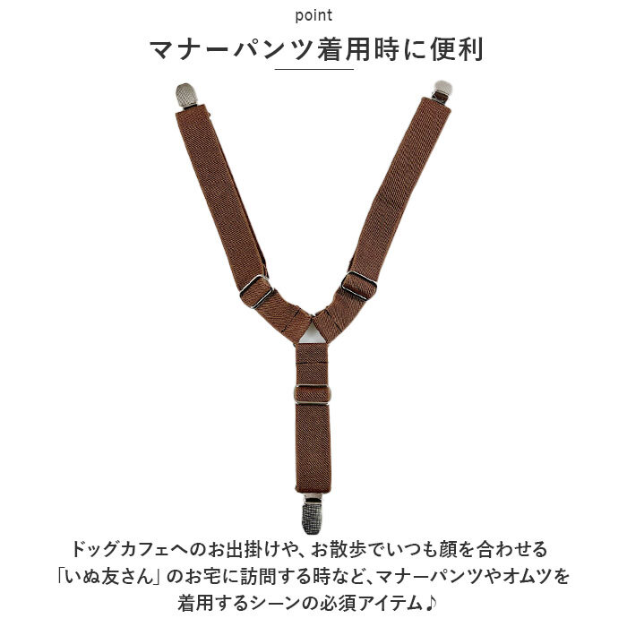 | 商品説明 | ・・お出掛け中のオムツのズレ、もう気にならない!お洒落で実用的なペット用サスペンダー。 ・【マナーパンツ着用時に便利】 ・ドッグカフェへのお出掛けや、お散歩でいつも顔を合わせる「いぬ友さん」のお宅に訪問する時など、マナーパンツやオムツを着用するシーンの必須アイテム♪ ・【装着は簡単・4ステップ!】 ・1.サスペンダー中央の三角形の金具をワンちゃんの身体の正面、胸の部分に当てるようにして、長さのある上部2本のベルトを肩に掛ける。 ・2.肩に掛けた2本のベルトを背中でクロスさせ、ベルト先端のクリップをオムツ後ろ側のウエスト2ヶ所にパチンッと留める。 ・3.次に胸の位置から下に垂らした補助ベルトのクリップを、オムツお腹側のウエストに留める。 ・4.各ベルトのアジャスターパーツをちょうどよい長さに調整したら完了! ・【やわらかゴムバンド採用】 ・肌触りが柔らかく、ワンちゃんの身体に負担のかからない、幅広約2.5cmのゴムバンドを採用。 ・【パンツやオムツがズレにくい】 ・クリップ内側には樹脂製の滑り止めを施し、バンドの外れを防いでオムツやマナーパンツをしっかりとホールド。 ・【アジャスターパーツで調節自在】 ・・3ヶ所のアジャスターパーツで、ベルトの長さをワンちゃんの身体にフィットするサイズに調節可能。 ・【ぴったりサイズをチョイス!】 ・S・M・Lサイズの3つのサイズの中から、ぴったりサイズがチョイス可能!超小型犬から中型のワンちゃんに最適なサイズ感。 ・【お散歩が楽しくなるデザイン】 ・ペットウェアやマナーパンツのデザインに合わせてコーディネート自在!種類豊富なパターン柄と色鮮やかなカラーバリエーションも魅力のひとつ。 |