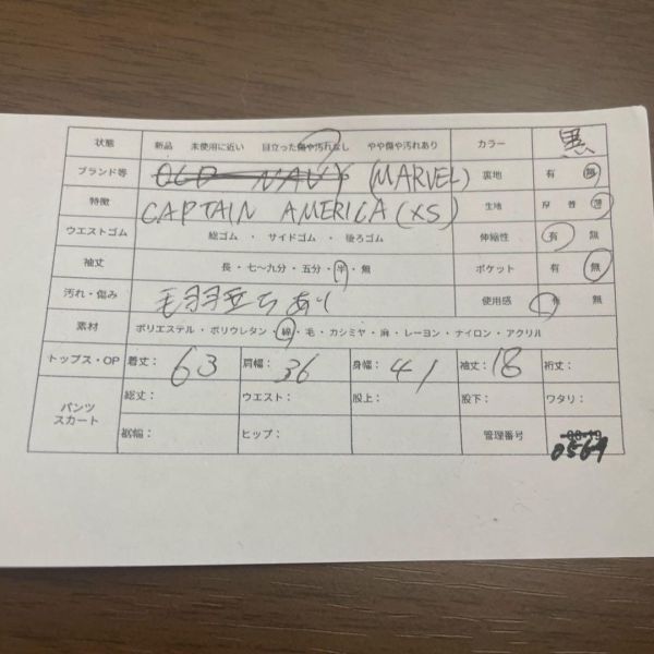 MARVEL好き必見!キャプテンアメリカが映えるクールなプリントTシャツ - ブランド:MARVEL - サイズ表記:XS - 素材:綿(コットン)主体(タグ表記参照) - カラー:黒 - 服の特徴:キャプテンアメリカプリント、半袖Tシャツ、クルーネックデザイン - ダメージ・汚れ詳細:毛羽立ちあり、使用感あり - 袖の長さ:半袖 管理番号: 05-69 即購入大歓迎・お得な割引各種あります 詳しくはプロフィールをご覧ください! 匿名&送料無料 海外輸入のため全て一点ものです 古着のため使用感・毛玉等があることもあります。写真で状態の確認を行なってからご購入ください おまとめ買いでお得な割引あります♪ 平置き採寸表→写真から確認いただけます! (素人採寸のため、多少の誤差はご了承ください) 商品状態に関しては、写真、商品説明欄に記載しております。着用回数、購入時期などはお答えできませんので、ご了承ください。着画、写真の追加もお断りしております。 簡易包装のコンパクト発送となります。 畳みシワはご了承の程、宜しくお願いいたします。 商品によっては圧縮してお送りするものもございます。 撮影環境や使用するモニター、反映されにくい色味など、 商品と画像に若干の色誤差が生じますことをご了承ください。 出品作業の際にしっかりと確認はしておりますが、シミなどの見落としがある場合もございますのでご了承下さい。 古着の取り扱いになりますので特有の匂い等がある可能性があります。ご理解のある方のみご購入の程お願い致します。