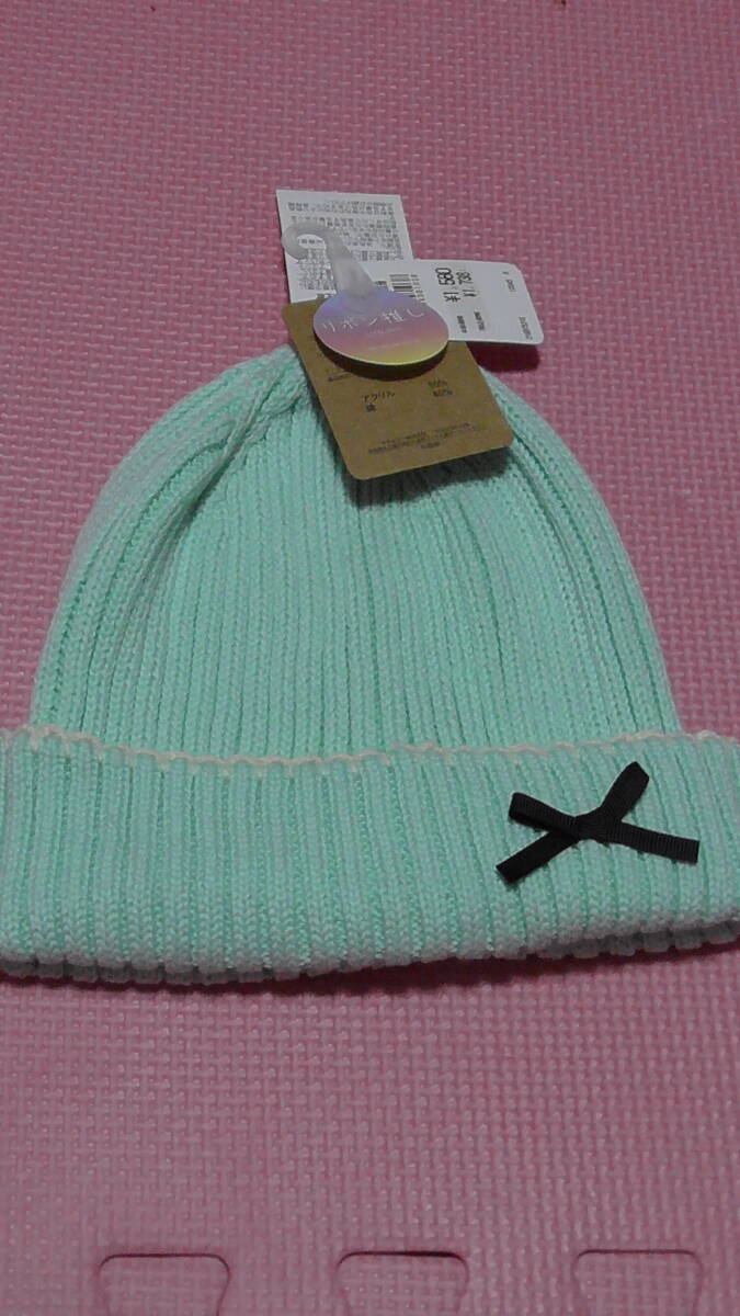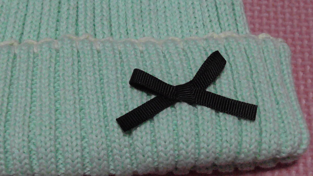 新品半額 リボン付 ニット帽 53cm~55cm ミント アクリルニットキャップ 子供 毛糸 帽子 保育園 幼稚園 小学生 女の子 双子 姉妹 送料無料