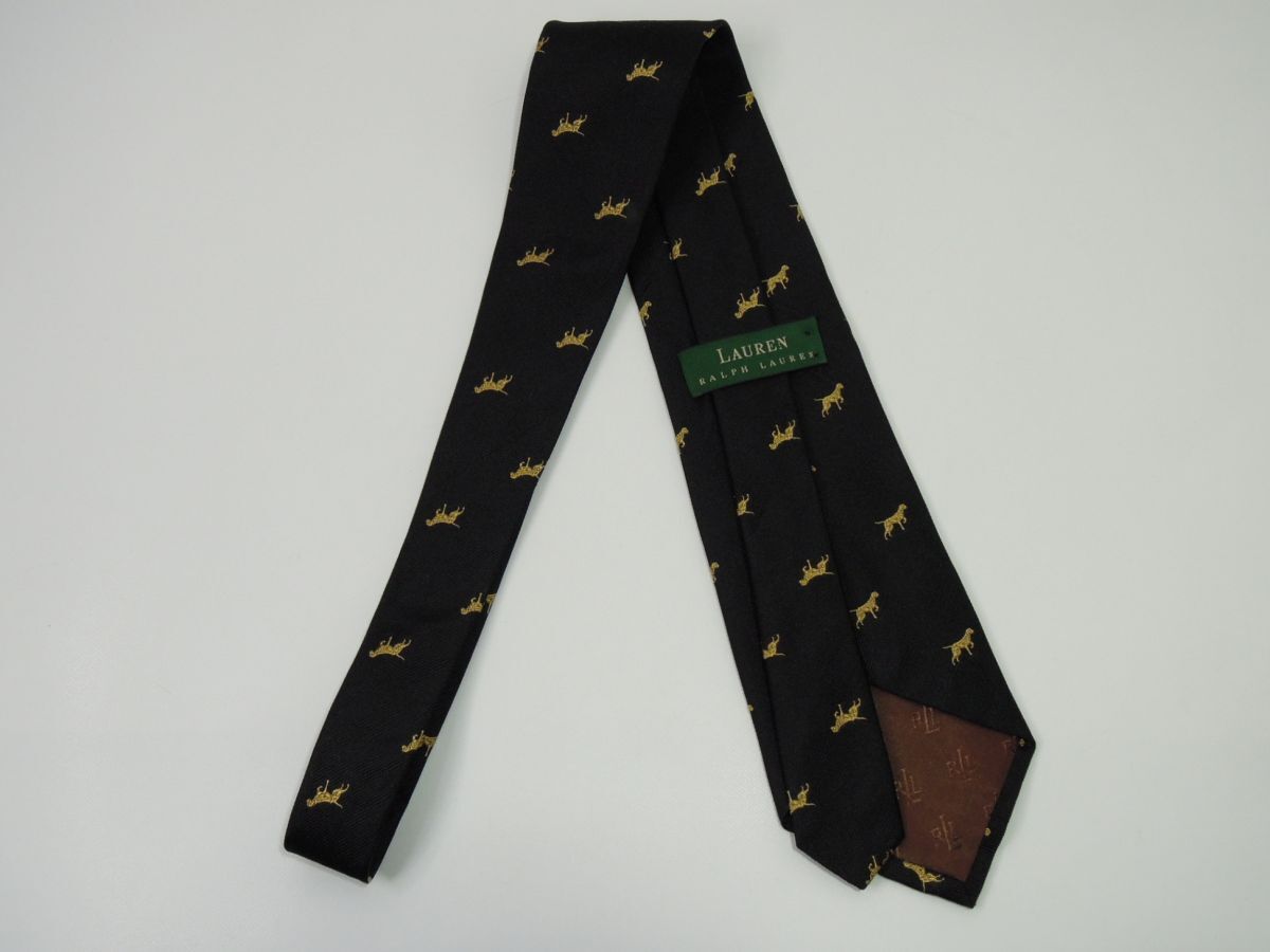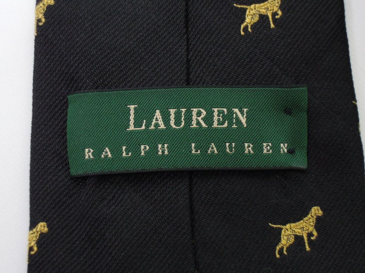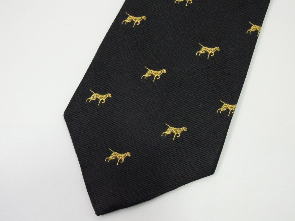 美品 Lauren Ralph Lauren ローレン ラルフローレン 狩猟犬刺繍 ポインター犬 シンプル アニマル小紋柄 ネクタイ ブラック 大剣幅9.7cm