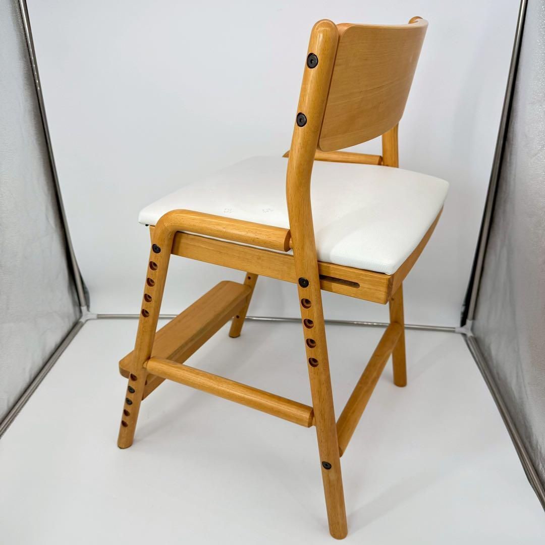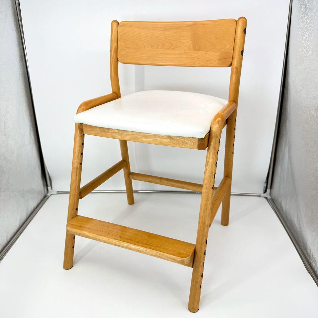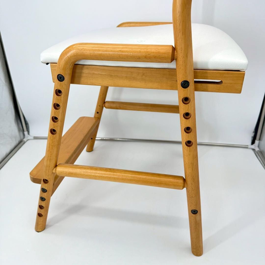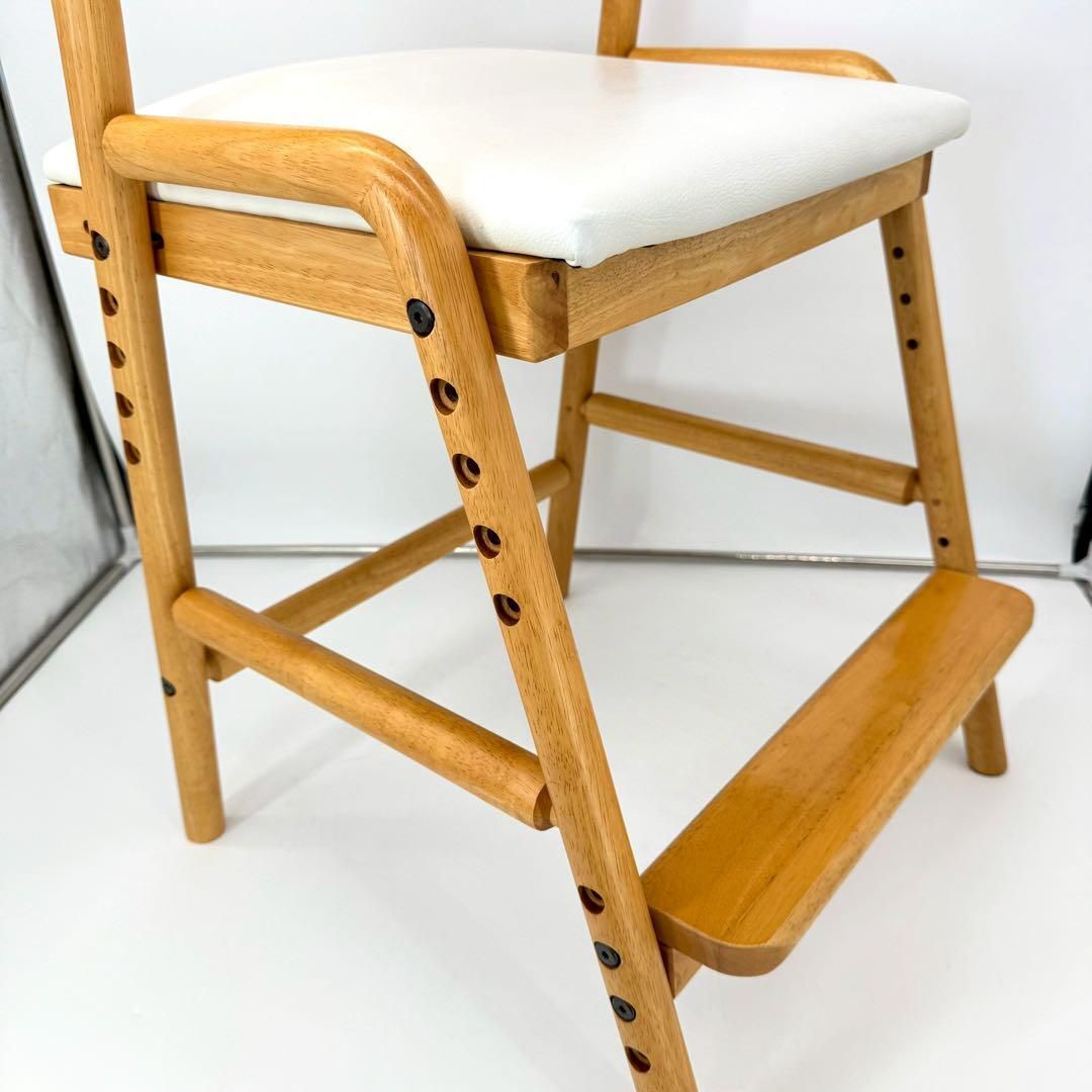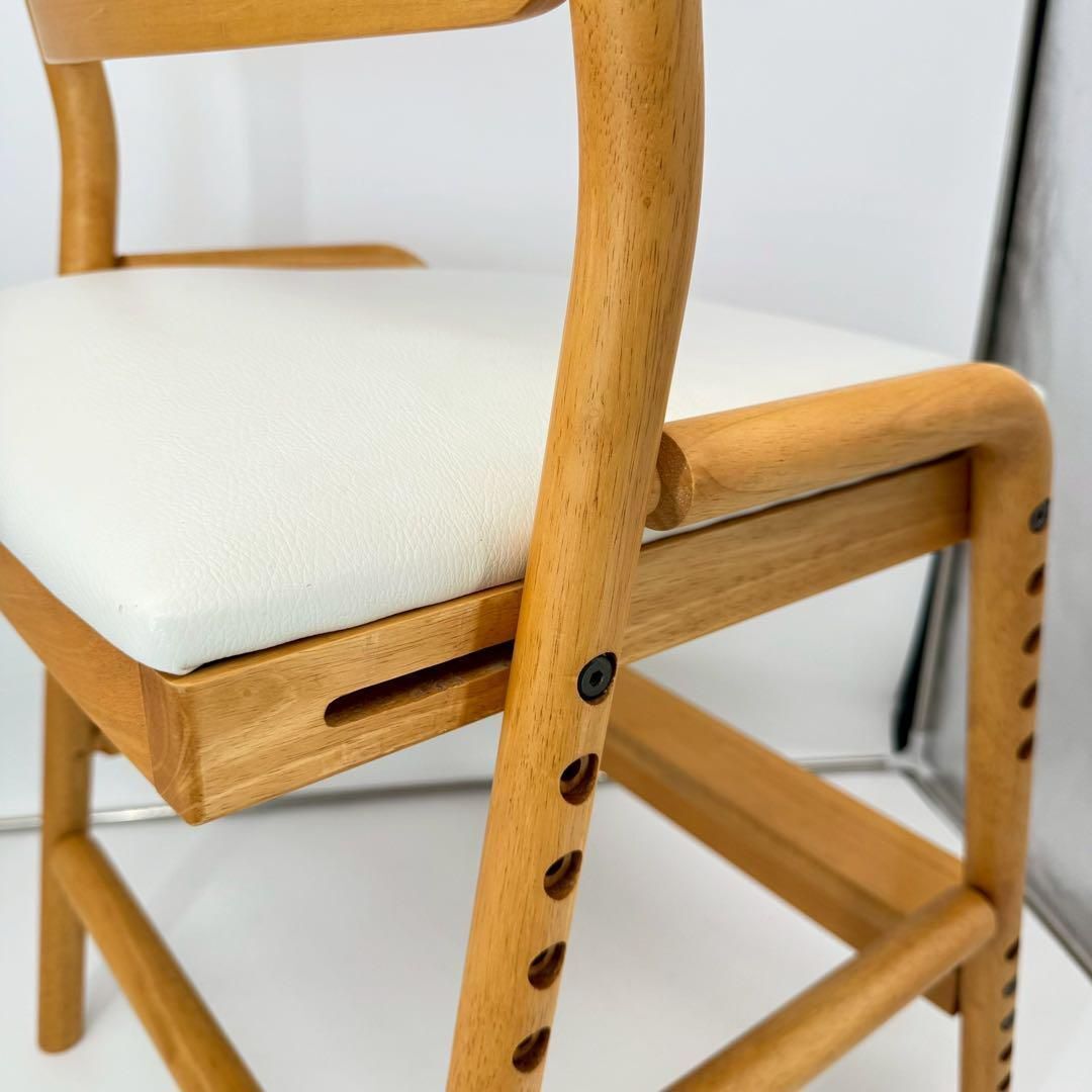 木製フレームと合成皮革の座面を持つ、ナチュラルなデザインのキッズチェア。