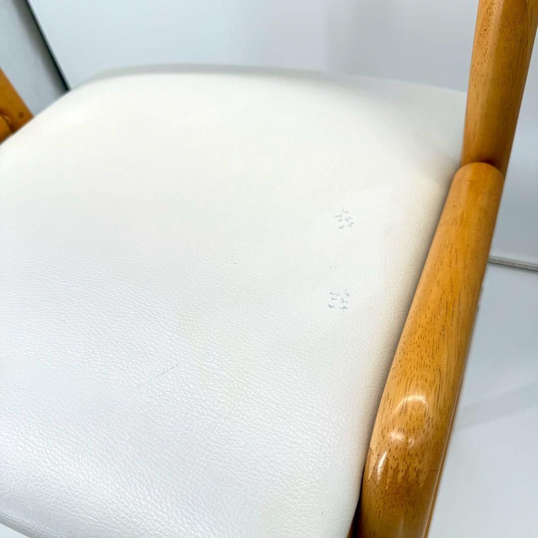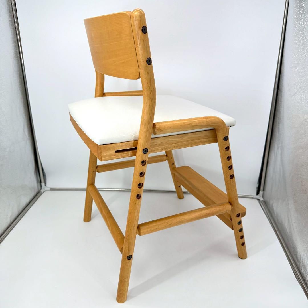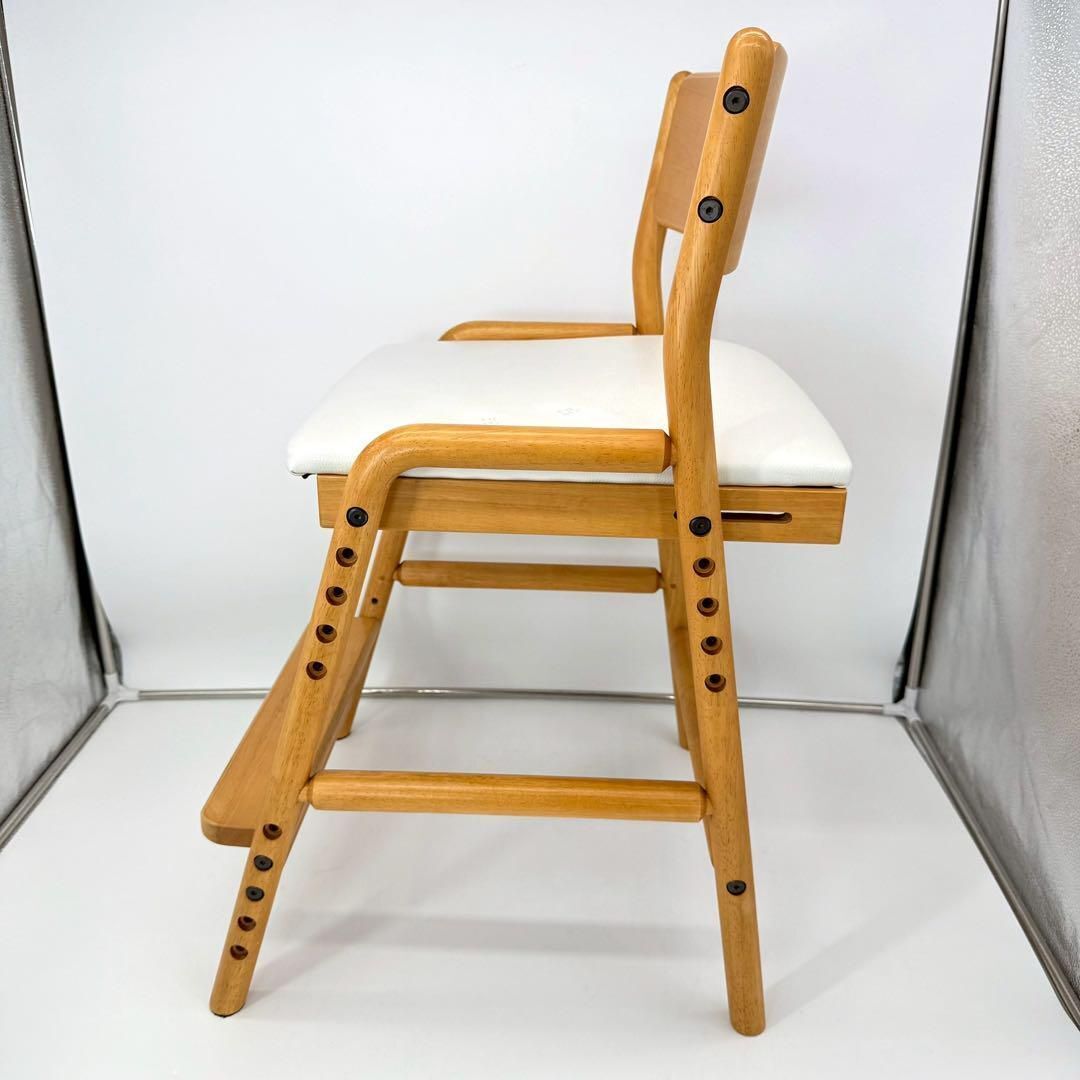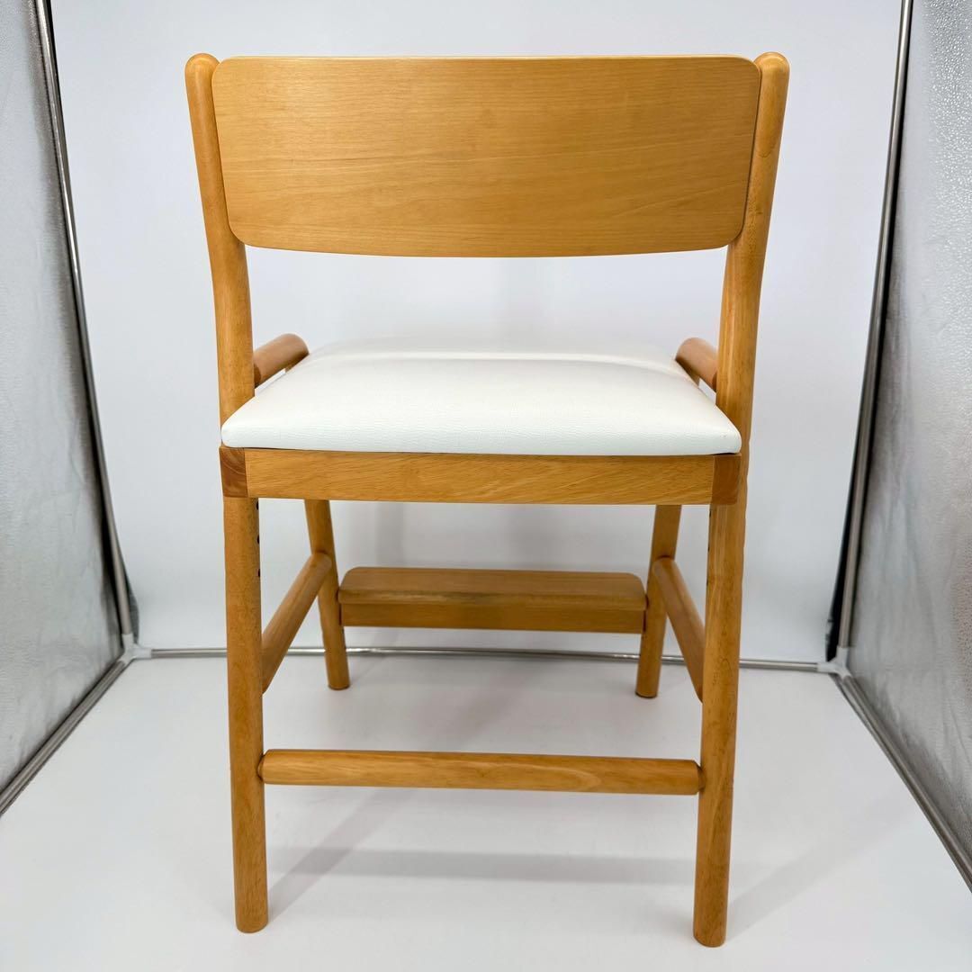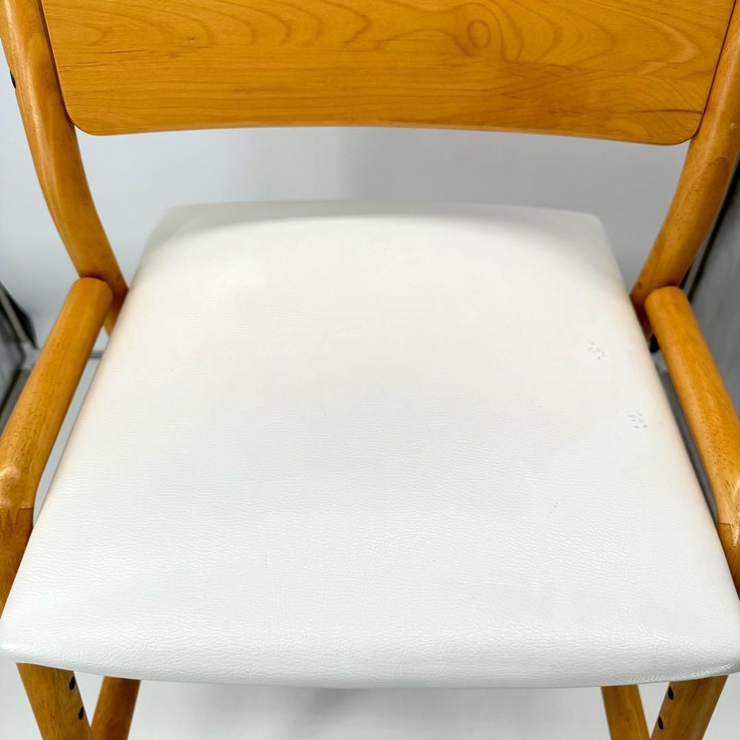 木製フレームと合成皮革の座面を持つ、ナチュラルなデザインのキッズチェア。