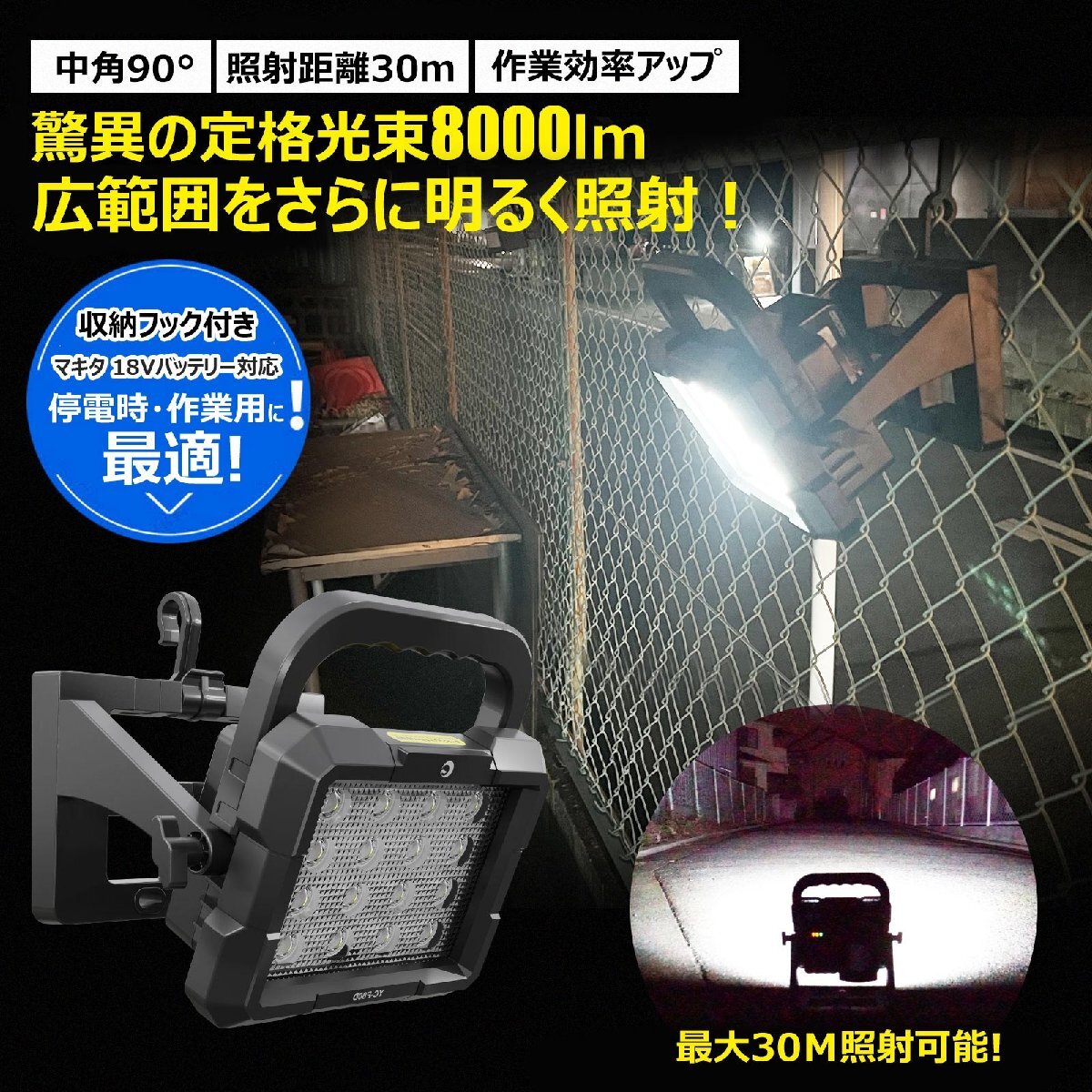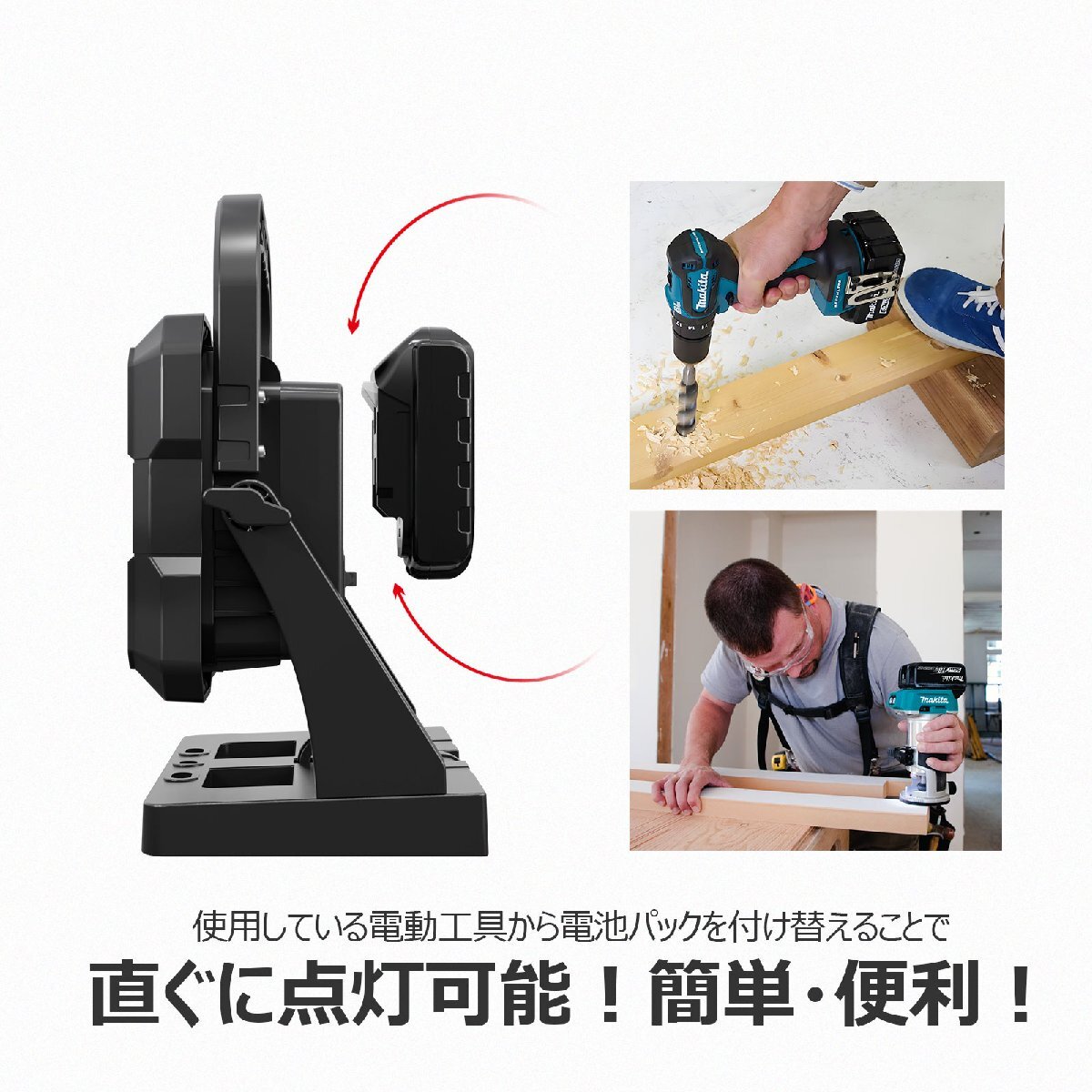 ★オススメポイント★ バッテリー着脱可能! バッテリーは着脱式なので、対応バッテリーがあれば長時間使用可能! ワンスライドで交換、使いたい時にすぐに! 18Vバッテリー2~6Ah全部対応可能!簡単に交換できるから、充電切れの心配なし!いつでも明るさを確保します。 耐衝撃性能 屋外使用も安心!衝撃耐性が強いダイカストを採用!br> 外でもスマホに充電出来るUSB出力機能! 投光器のUSB出力で、スマホやタブレットを手軽に充電! |