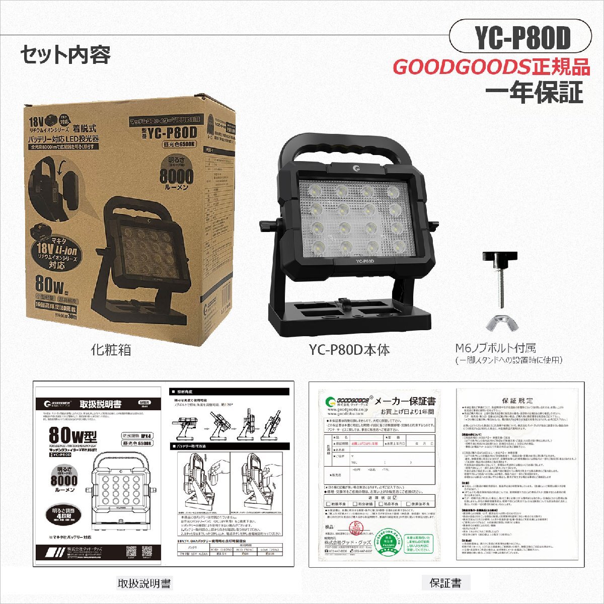 | セット内容 | 投光器本体、M6蝶ナット、M6ノブボルト、 取扱説明書、保証書 | ||