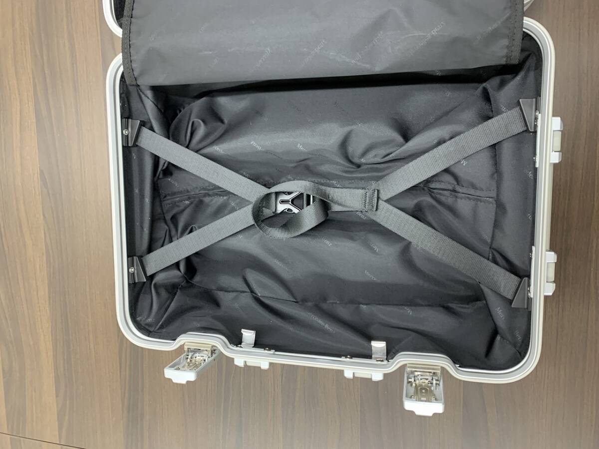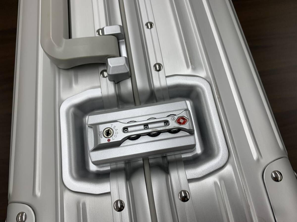 シルバーのアルミニウム製キャリーケース、ストライプデザイン、専用カバー付き。