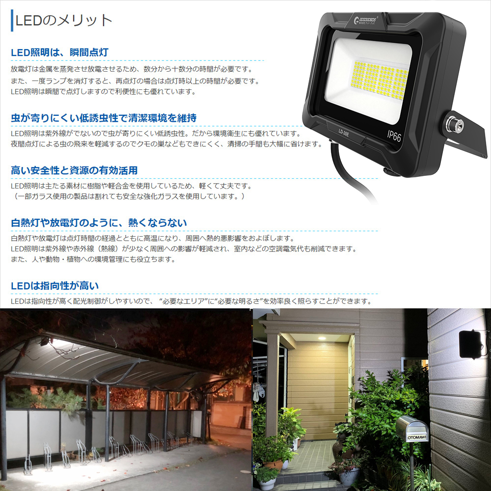 ポイント1:【LED・高輝度】 ◎112個高品質なLEDチップを30W投光器に初採用、約4500lmの圧倒的な明るさを実現し、120°の広範囲を照射します。 ◎省電力・小出力のSMD高効率LEDチップを採用することで、チップの発熱量を抑え、散熱効率を高くなります。効果よくLED周辺の熱だまりを防げ、使用寿命が延ばせます。 ◎すりガラスの採用!ガラス面には、すりガラス加工を施し光が拡散し、刺激的な眩しさを軽減します。 ◎ライト近くに影ができにくく目に優しく照射します。色温5000K 自然光に近い昼白色明るいのに眩しくないです! ポイント2:【2Mコード・PSE表示付き】 ◎コード長2M!コンセントまでの距離がある場合でも安心です。 ◎長さ2Mの電源コードはPSE表示付きの安心品質です。 ◎ステー300°角度調整と照射120°範囲が作動スペースを更に増大できます。 ポイント3:【一体型放熱フィンデザイン】 ◎一体型放熱フィンデザインを採用します。 ◎放熱性に優れているアルミボディー、ADC12アルミダイカスト素材を採用します! ポイント4:【アルミ素材+強化ガラス】 ◎アルミ素材+強化ガラスを贅沢に使い、従来品より耐久性が格段に向上しています。耐衝撃、耐振動、丈夫な設計で安全性・安定性・信頼性抜群です。 ◎製品の材質だけでなく、その設計や加工技術により製品寿命を大幅に引き上げました。 ポイント5:【結露防止用のフィルター・IP66防水】 ◎結露防止用のフィルターを採用します。 ◎筐体の底部には、防水性能はそのままに筐体内の余分な水分を逃がす通気弁を設けました。過度な湿度を逃しガラス面の結露・水だまりによる故障を防げます。 ◎IP66相当の防塵・防水性能!本体は 防水防雨仕様なので、工場・作業場だけでなく屋外での使用も可能です! ◎室外や室内の照明と看板、倉庫・作業場・安全照明としても最適です! ポイント6:いろいろなシーンで大活躍! ◎看板灯、駐車場灯、インテリア照明・ 樹木や店舗壁面などのライトアップ照明、看板照明や店内の演出用照明、屋外用照明としてご利用頂けます。 ◎公共場所、駐車場、事務所、展示場に使用、 街灯、公園、ホール、玄関常夜灯、町内防犯灯、夜間作業を行う際の照明として使用します! ◎大規模施設照明用に大いに役が立てます。AC95~135Vの広範囲で、産業施設からスポーツ施設全般に対応!ゴルフ練習場、スポーツ・テニスコート、駐車場、格納庫、工場、倉庫など様々な場面で活用できます。 |