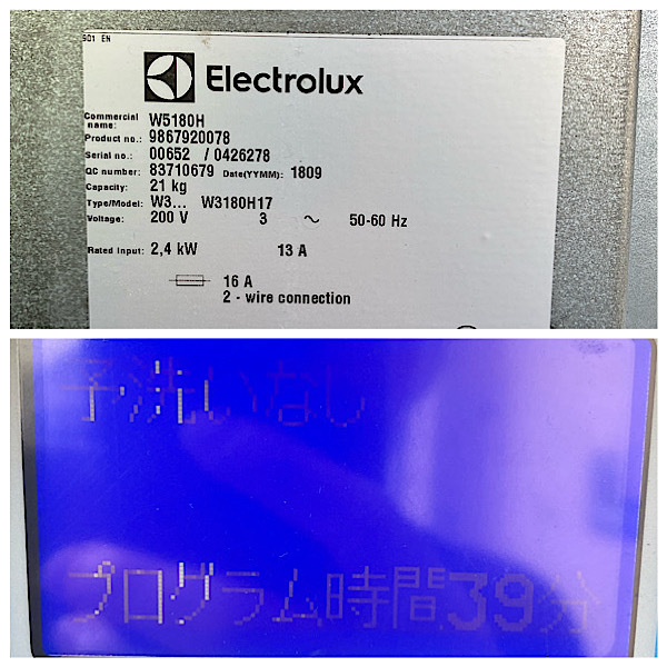| 規格・仕様 | 型式:W5180H 最大処理量:20kg ドラム容量:180リットル(直径725mm) ドラム回転数:1055rpm 接続口径、給水:3/4”(20A) 接続口径、給湯:3/4”(20A) 接続口径、排水:外径、直径75mm(呼び径65mm) 消費水量:159リットル(普通洗い60℃の場合) 消費電力量:0.5kWh 定格消費電力:2.4kW 推奨ブレーカー容量:16A 電源:三相200V 50/60Hz 本体寸法:幅970x奥行970x高さ1330mm 本体重量:350kg |