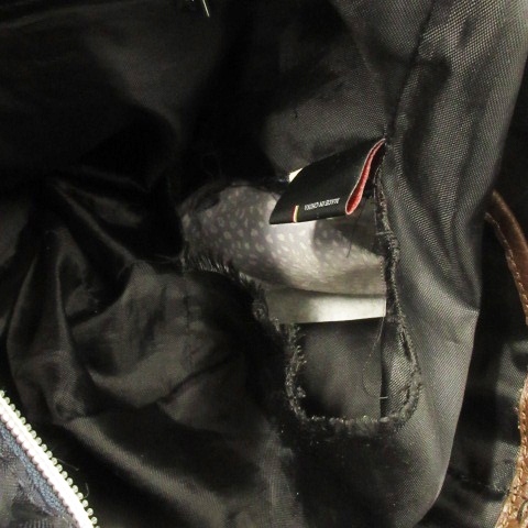 【状態】この商品には下記のようなダメージがあります。 ・内側生地に破れ ・レザーに若干の使用感 ※全体的に中古品としての使用感とダメージがありますが、通常使用には支障のない商品です。 掲載写真や記載内容をご確認いただき、ご理解の上ご購入ください。