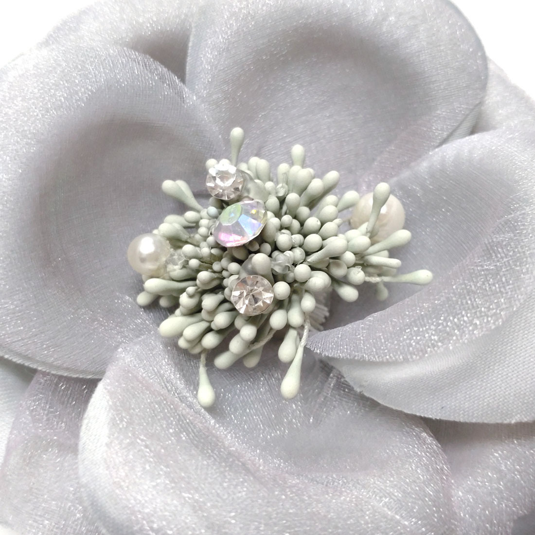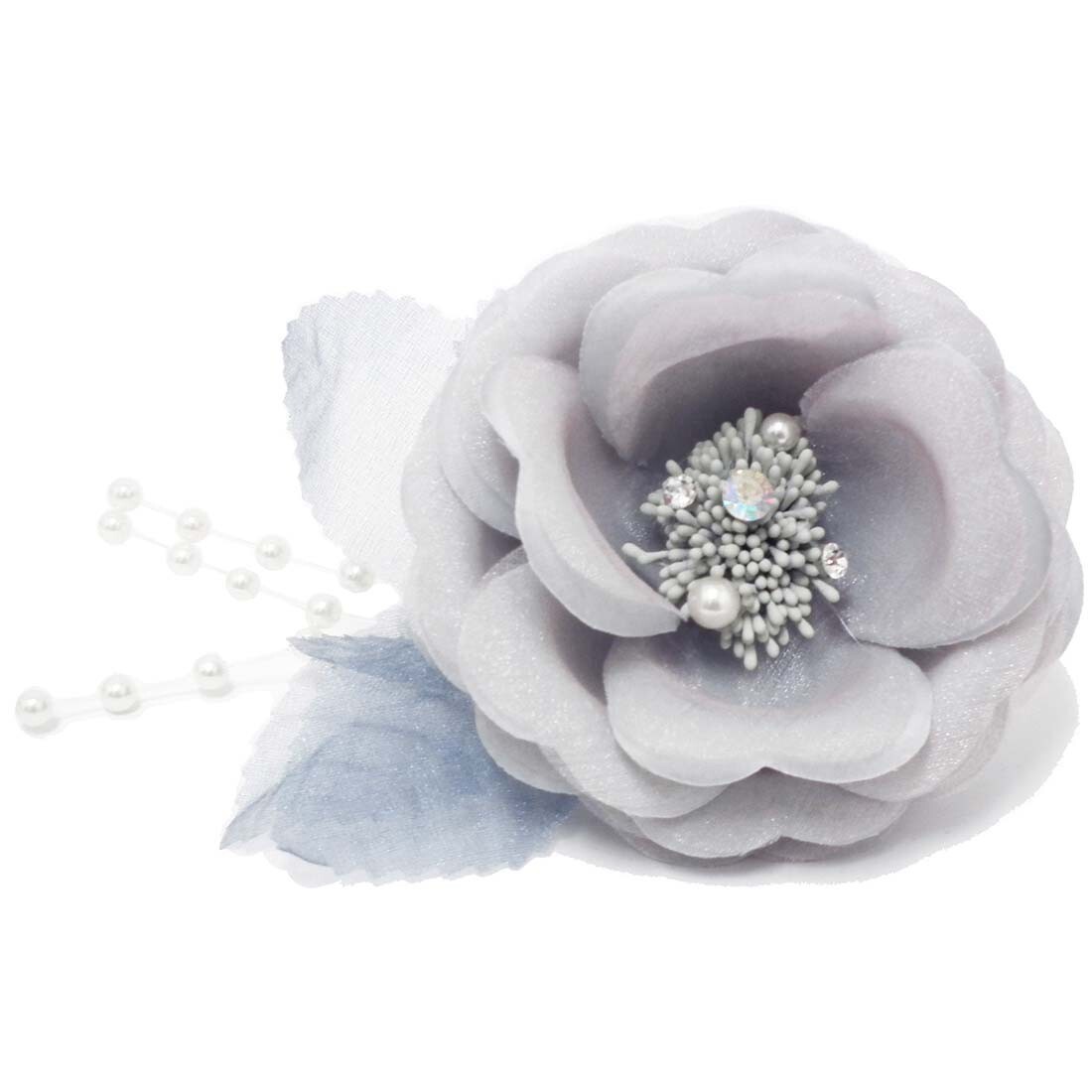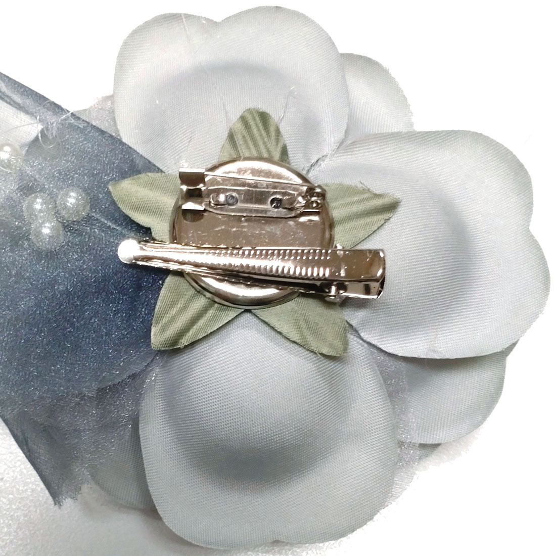 丸みのあるコロンとした大きめの花びらに、透け感が美しいレース生地のリーフ(葉っぱ)が付いたコサージュです。 |