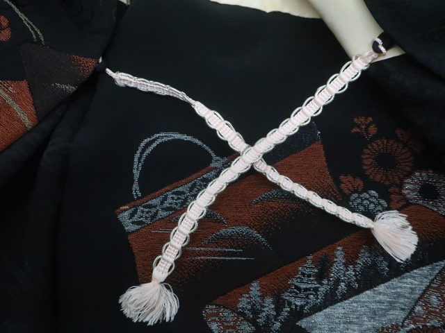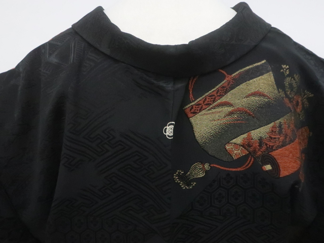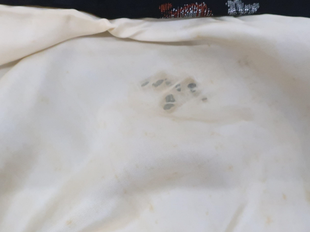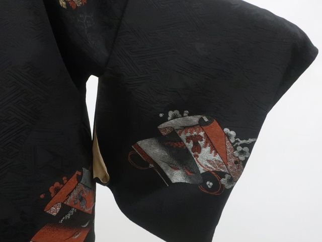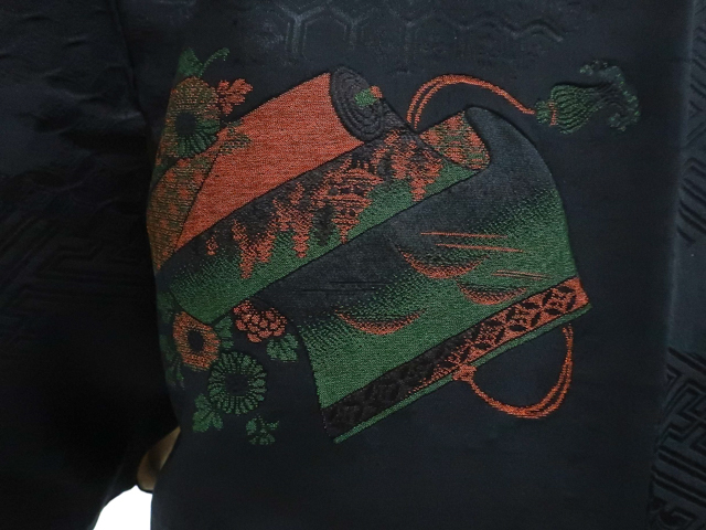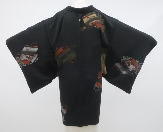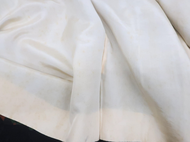 | リサイクル商品のため、羽裏全体にしみがございます。 右後肩・左後袖に汚れがございますが着用可能なお品です。 地色は黒です。 1枚目の画像が近いお色かと思われます。 素材は正絹です。 |