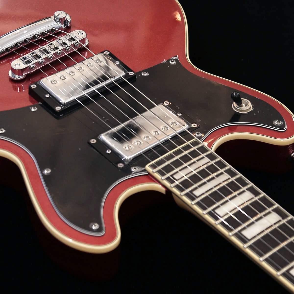 ボディー・トップ、ヘッドストックとネックにはバインディングが装飾され、ホワイト・パーロイド・ブロック・ポジションマーカーと組み合わせたデザインです。
