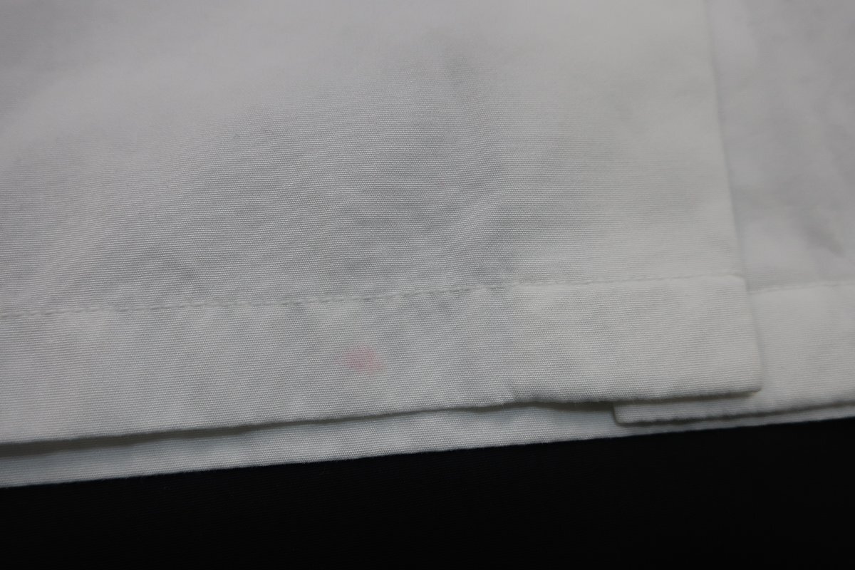 また、襟ぐりや両袖口にに黄ばみ汚れ、下部に赤い汚れが見受けられます。