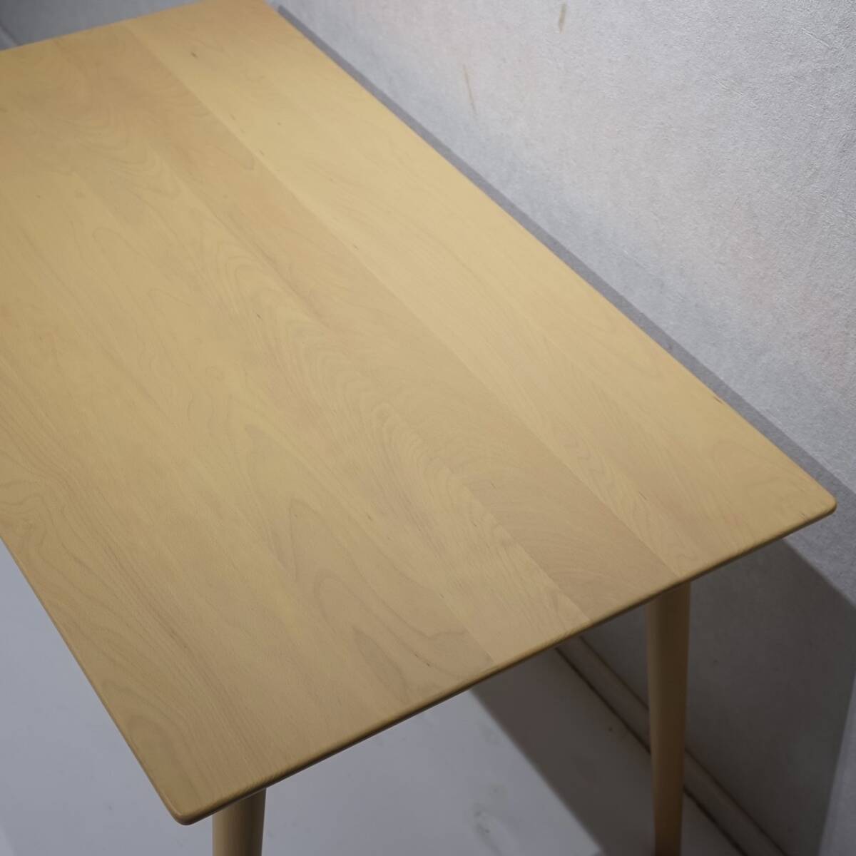 ナチュラルな木肌の美しい天板と、軽やかに外側へ伸びる先細りの丸脚が特徴で、暮らしに柔らかな温もりと洗練された印象を与えます。