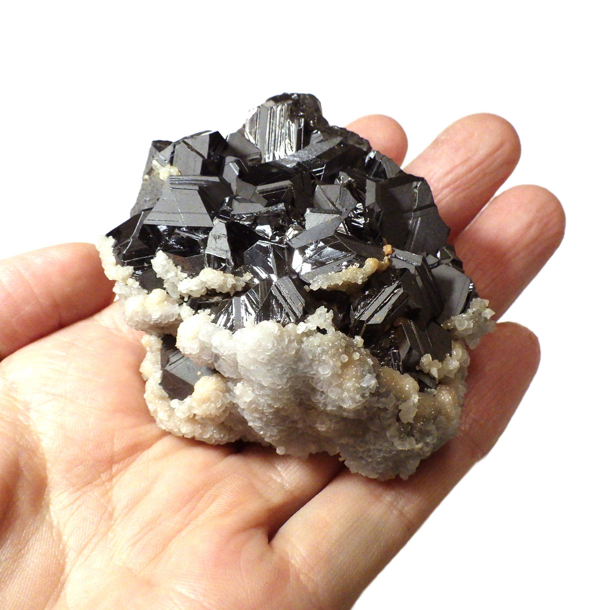 鉄の含有量が多いほど黒くなり、産出するスファレライトの多くはこの黒色タイプで「マーマタイト」と呼ばれています。本品は比較的大きめの結晶を持ち、金属光沢のある黒い輝きが印象的です。また、クォーツ(水晶)やチャルコパイライト(黄銅鉱)などの共生も見られ、ずっしりとした重みとともに、眺めて楽しめる魅力的な標本です。