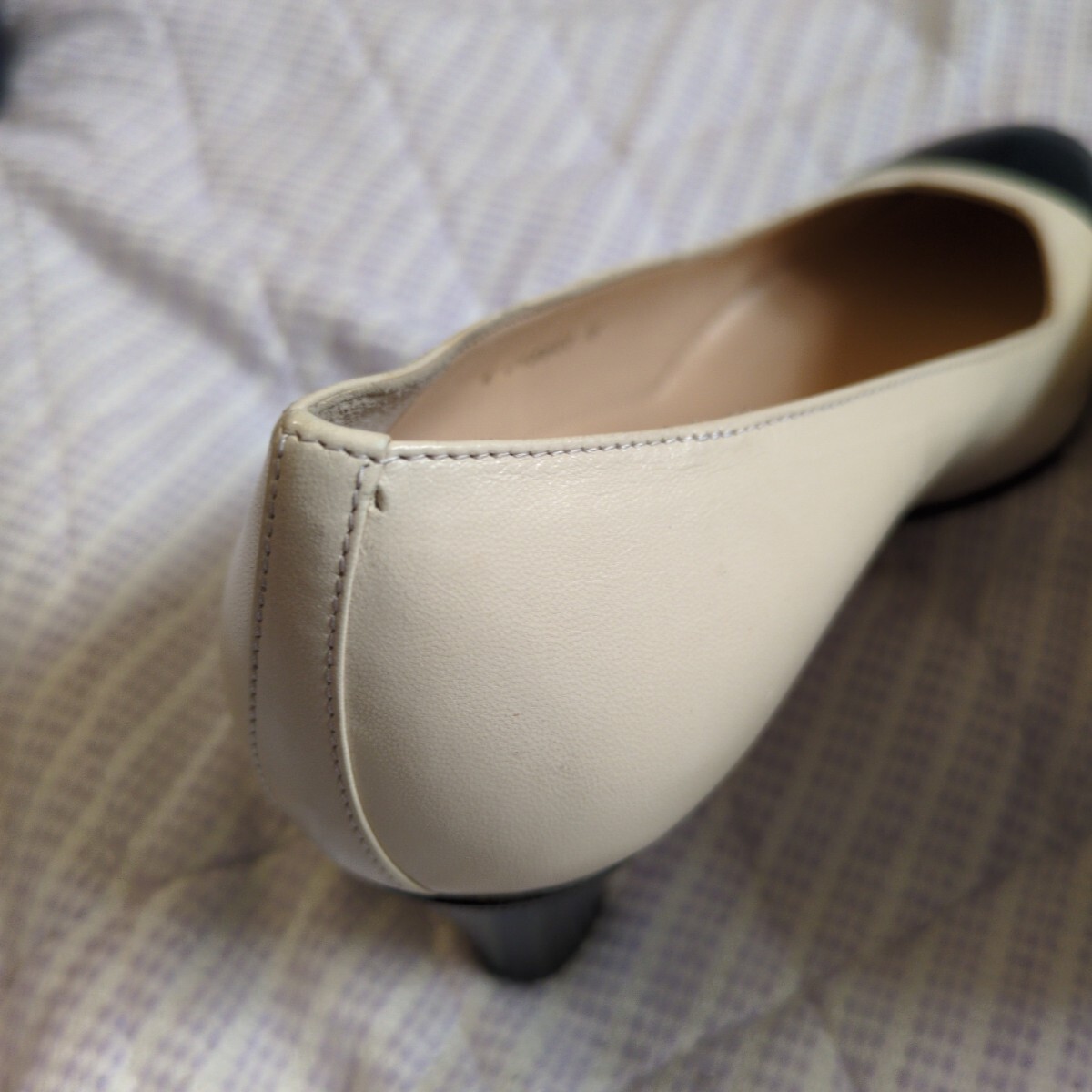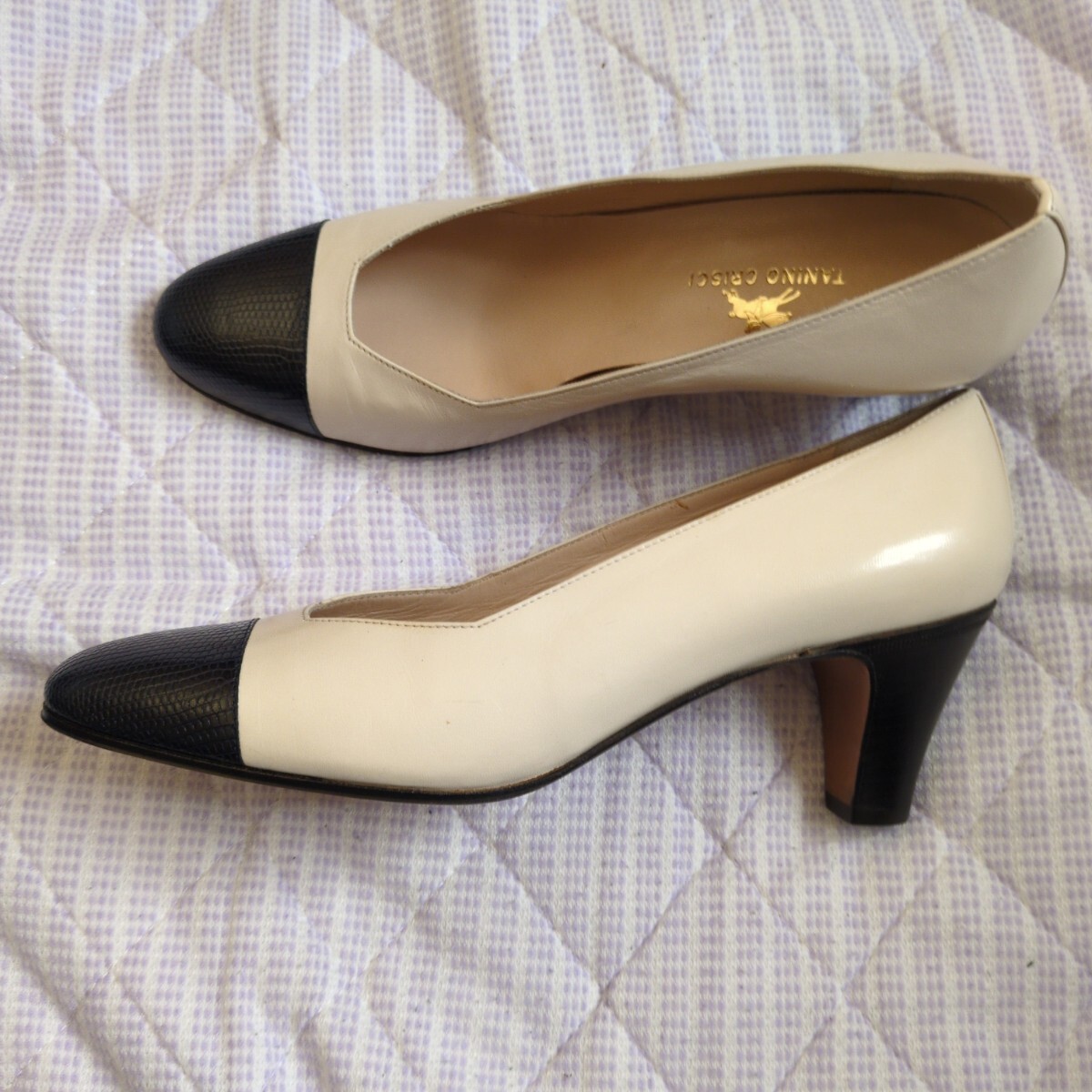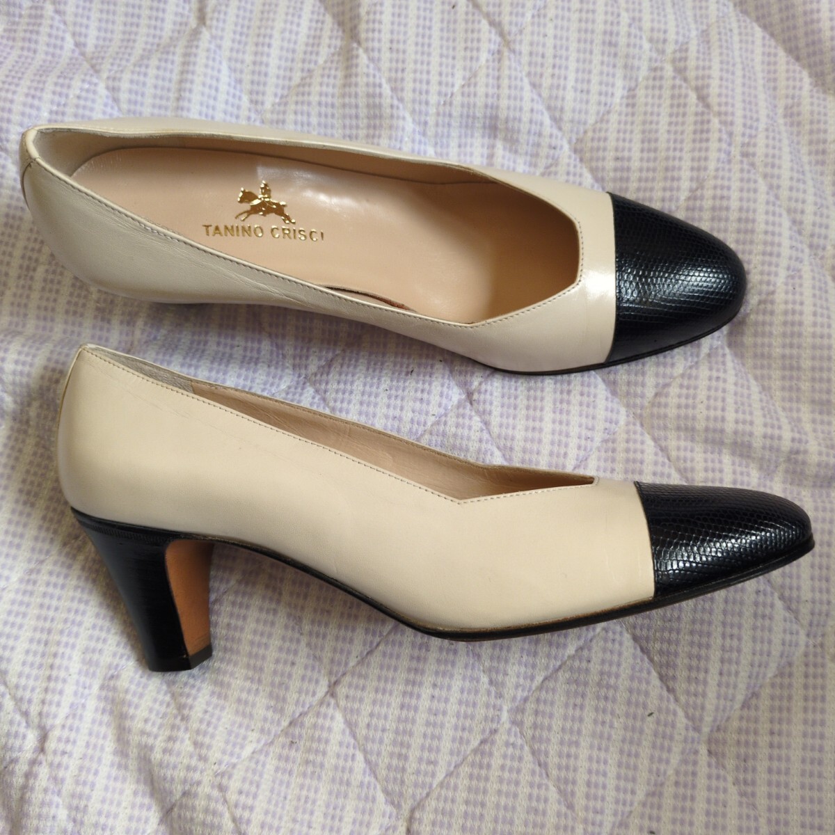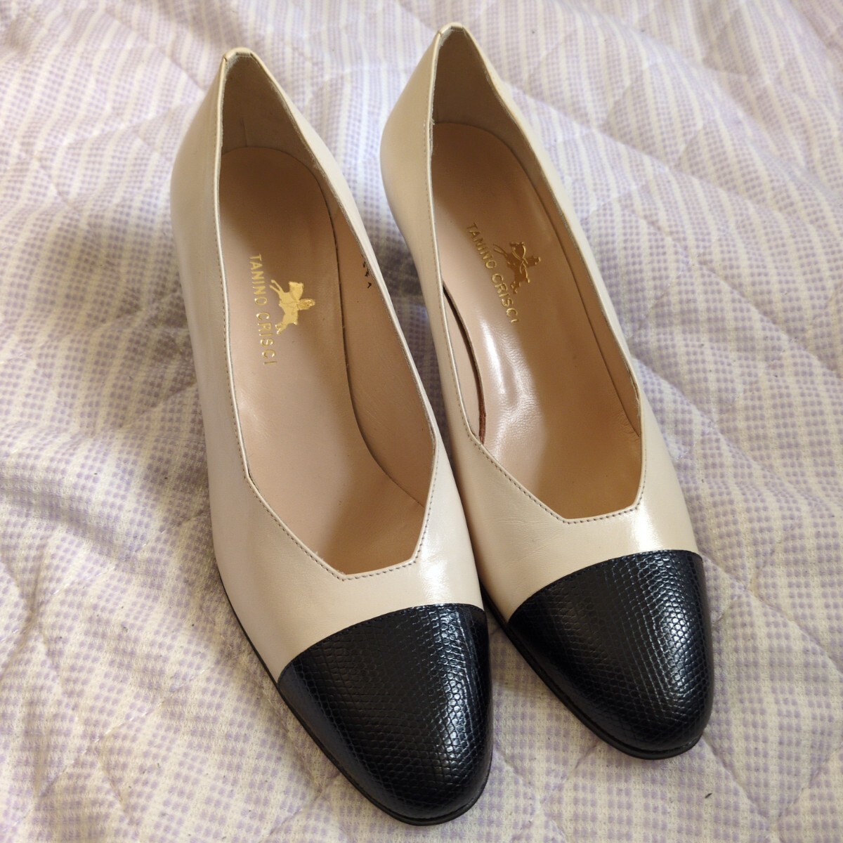 今は無きイタリアの幻の高級ブランド、タニノクリスチーのアイボリーとネイビーのバイカラーのレザーパンプス。