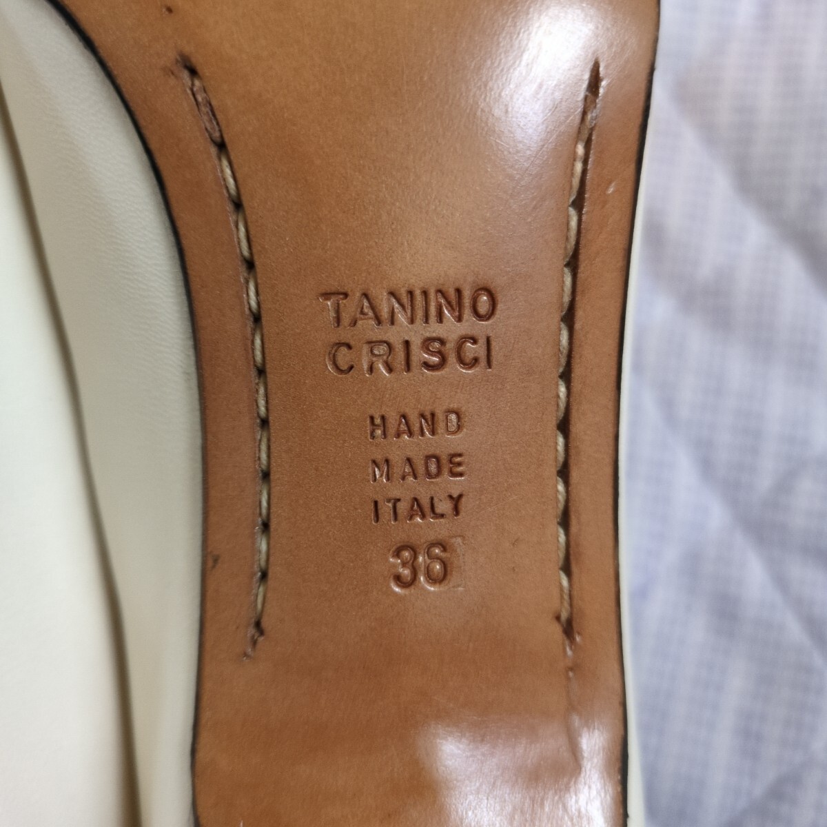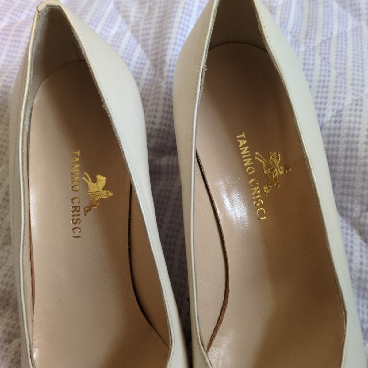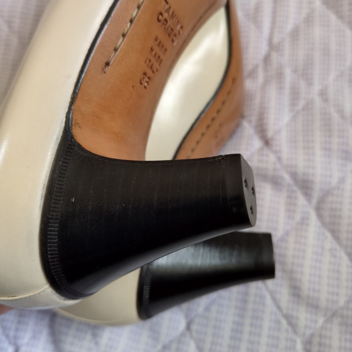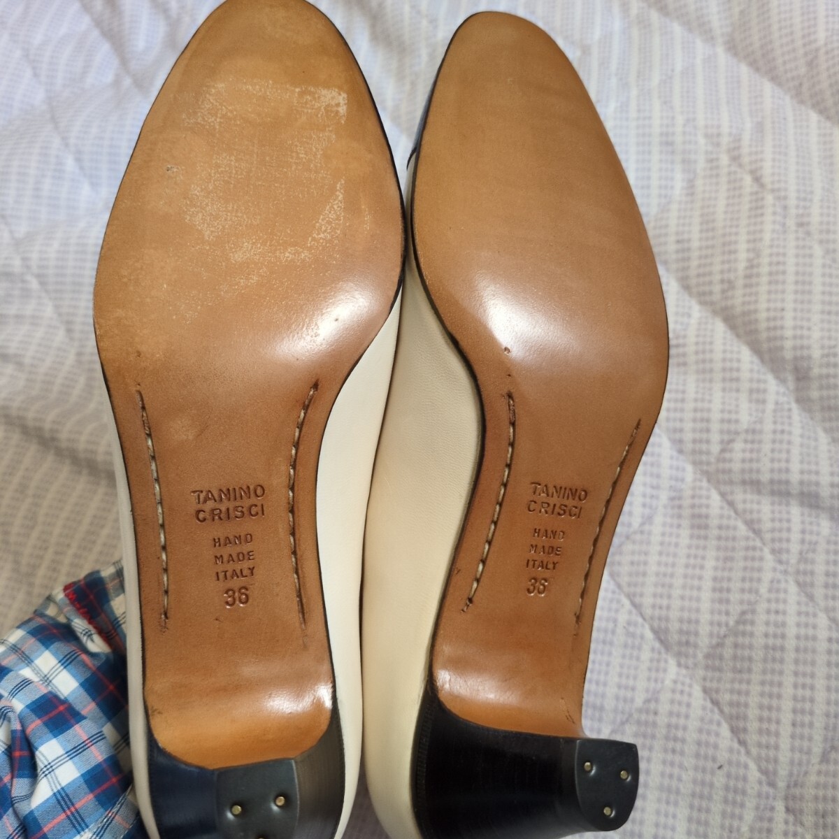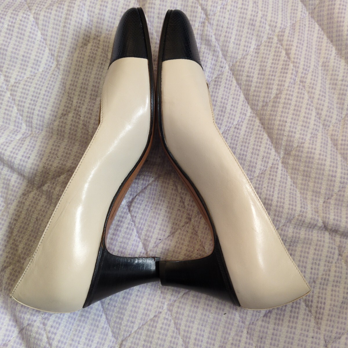 今は無きイタリアの幻の高級ブランド、タニノクリスチーのアイボリーとネイビーのバイカラーのレザーパンプス。