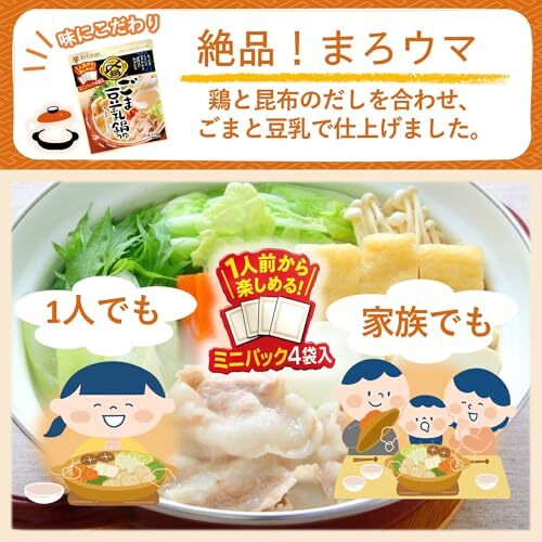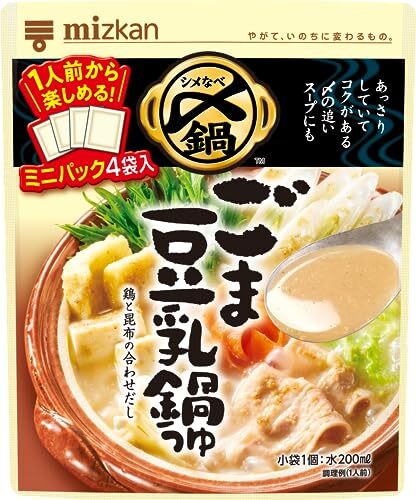 商品紹介 コクがある味わいなので、お鍋はもちろん、〆まで美味しく食べられる鍋つゆ(鍋の素・鍋スープ)シリーズです。1人前ずつ包装された濃縮タイプの鍋つゆなので、一人鍋からご家族まで、人数にあわせてお使いいただけます。鶏と昆布のだしを合わせ、ごまと豆乳で仕上げた、あっさりしていてコクがある、まろやかな味わいのごま豆乳鍋つゆです。〆は、パスタを使ったごま豆乳カルボナーラがオススメです。こなべっちからのリニューアル商品です。1人前使い切りの小袋4袋入りです。 原材料・成分 砂糖(国内製造)、すりごま、ねりごま、豆乳(大豆を含む)、食塩、大豆粉末、鶏がらだし、ごま油、豚脂、酵母エキス、香味油、こんぶだし/調味料(アミノ酸等)、レシチン(大豆由来)、炭酸カリウム