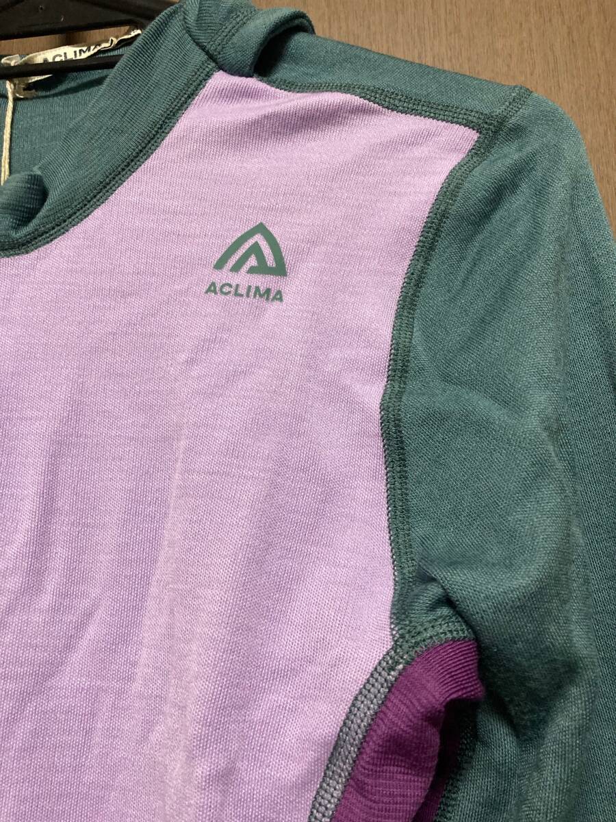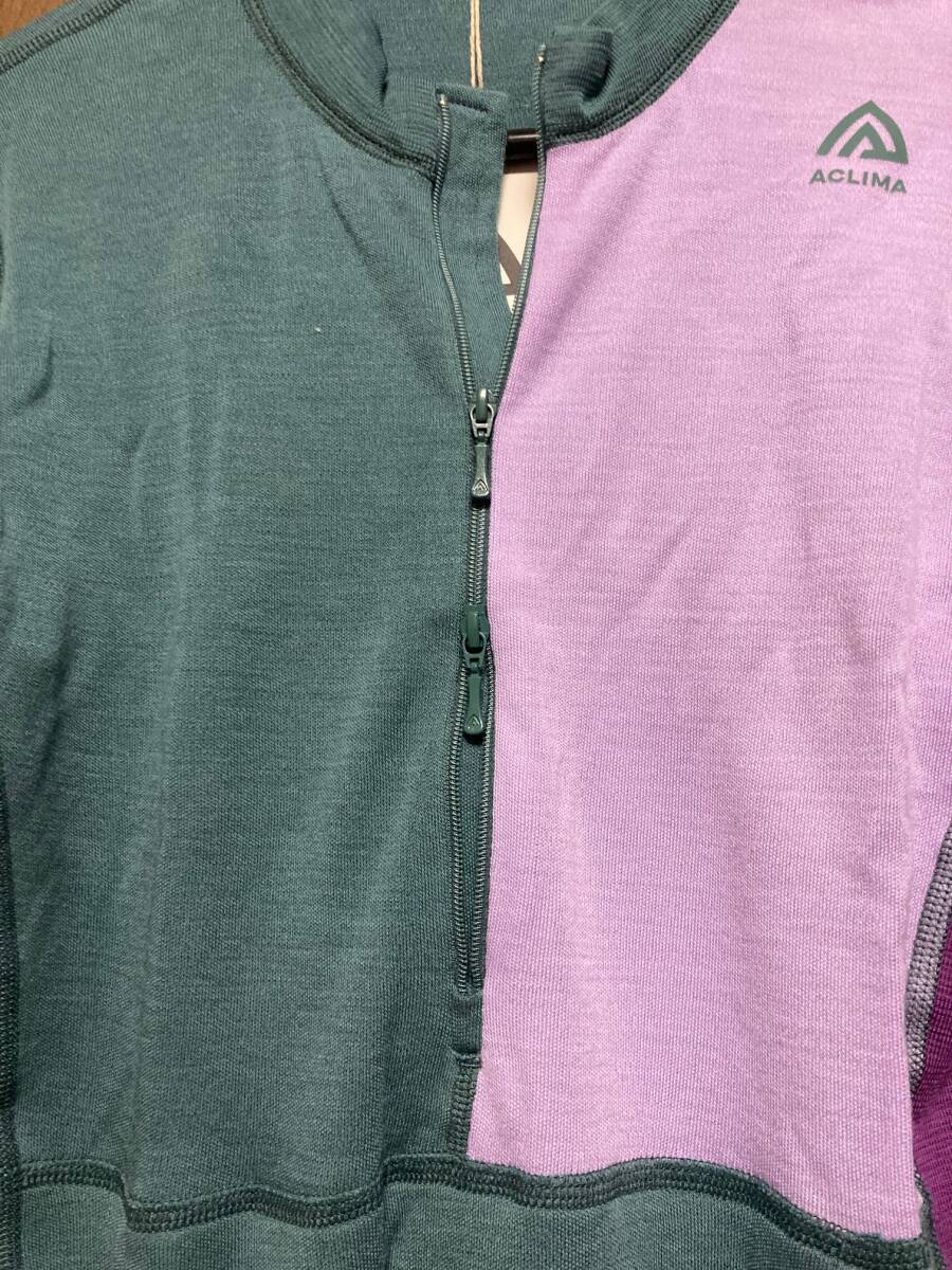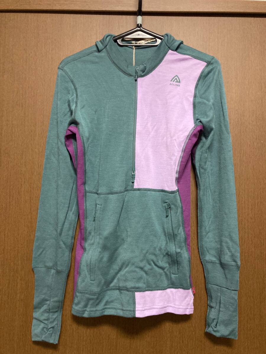 フルマークスで30,800円で購入しましたアクリマACLIMAのウールジップトップスです。サイズはXS(日本のSサイズほどです、当方161センチ、47キロでちょうど良いサイズでした)。全くの未使用タグ付き、たいせつにほかんしておりましたので とても綺麗な状態ですが、購入時よりフードにお写真にありますように小さなシミがございます。ご了承くださいませ。お色は肌馴染みのいい落ち着いたグリーンに、パープルの濃淡が配置されたヨーロッパらしい洗練されたデザインです。
