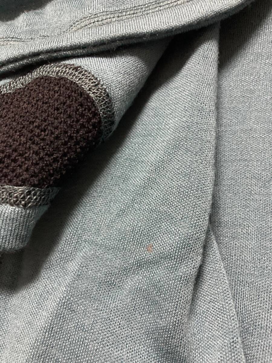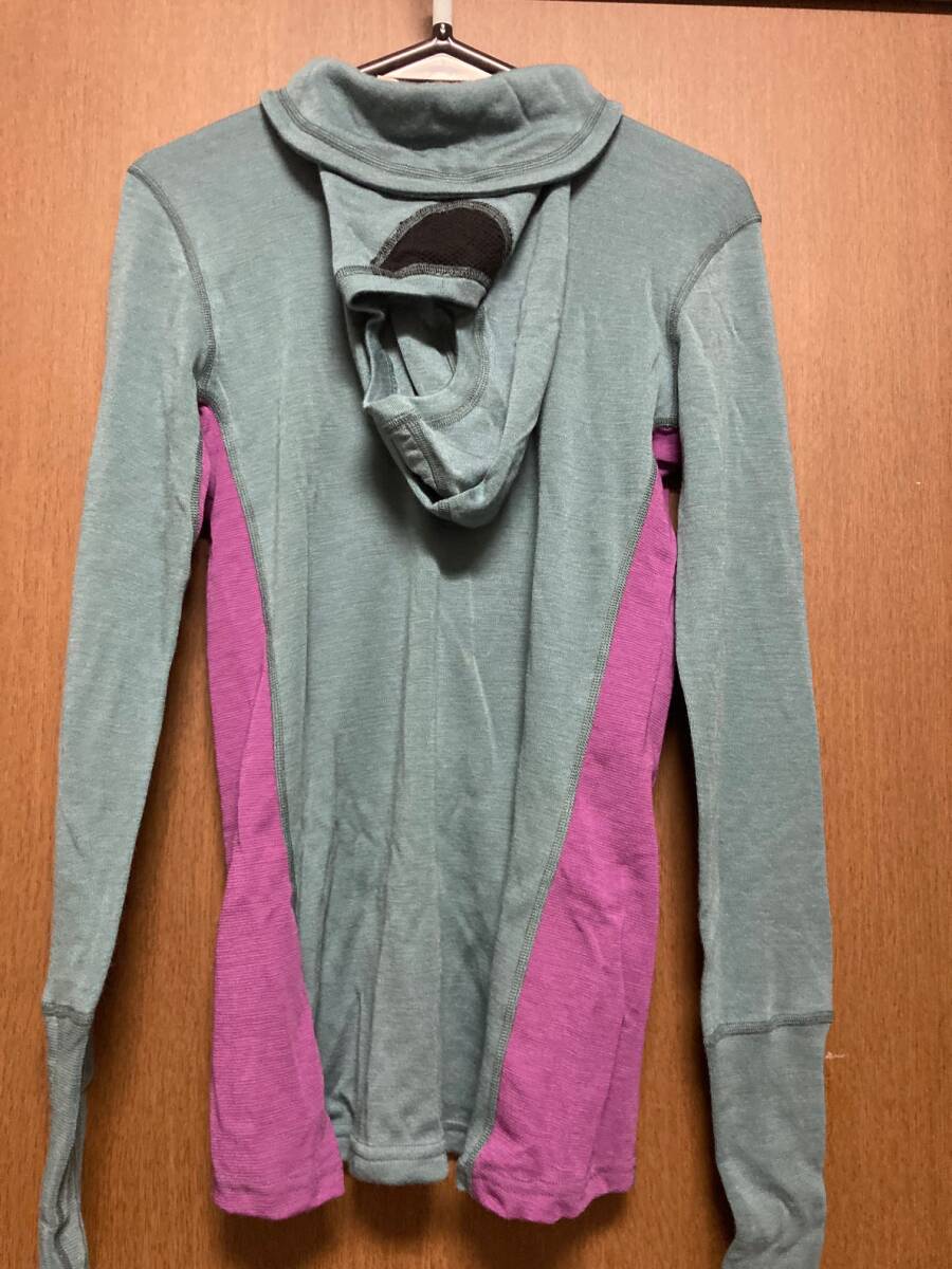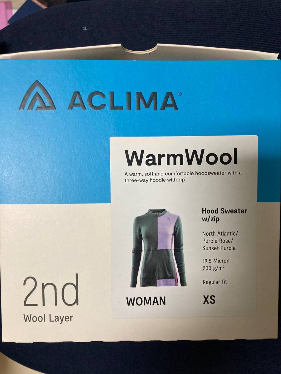 フルマークスで30,800円で購入しましたアクリマACLIMAのウールジップトップスです。サイズはXS(日本のSサイズほどです、当方161センチ、47キロでちょうど良いサイズでした)。全くの未使用タグ付き、たいせつにほかんしておりましたので とても綺麗な状態ですが、購入時よりフードにお写真にありますように小さなシミがございます。ご了承くださいませ。お色は肌馴染みのいい落ち着いたグリーンに、パープルの濃淡が配置されたヨーロッパらしい洗練されたデザインです。