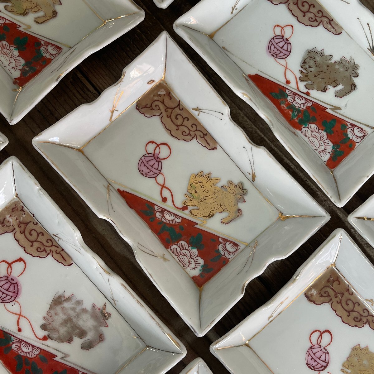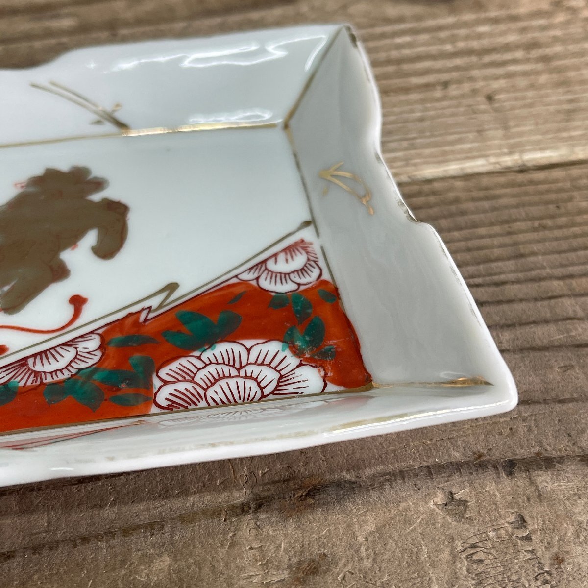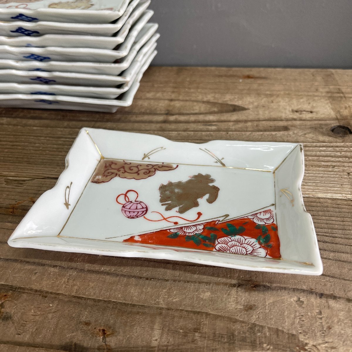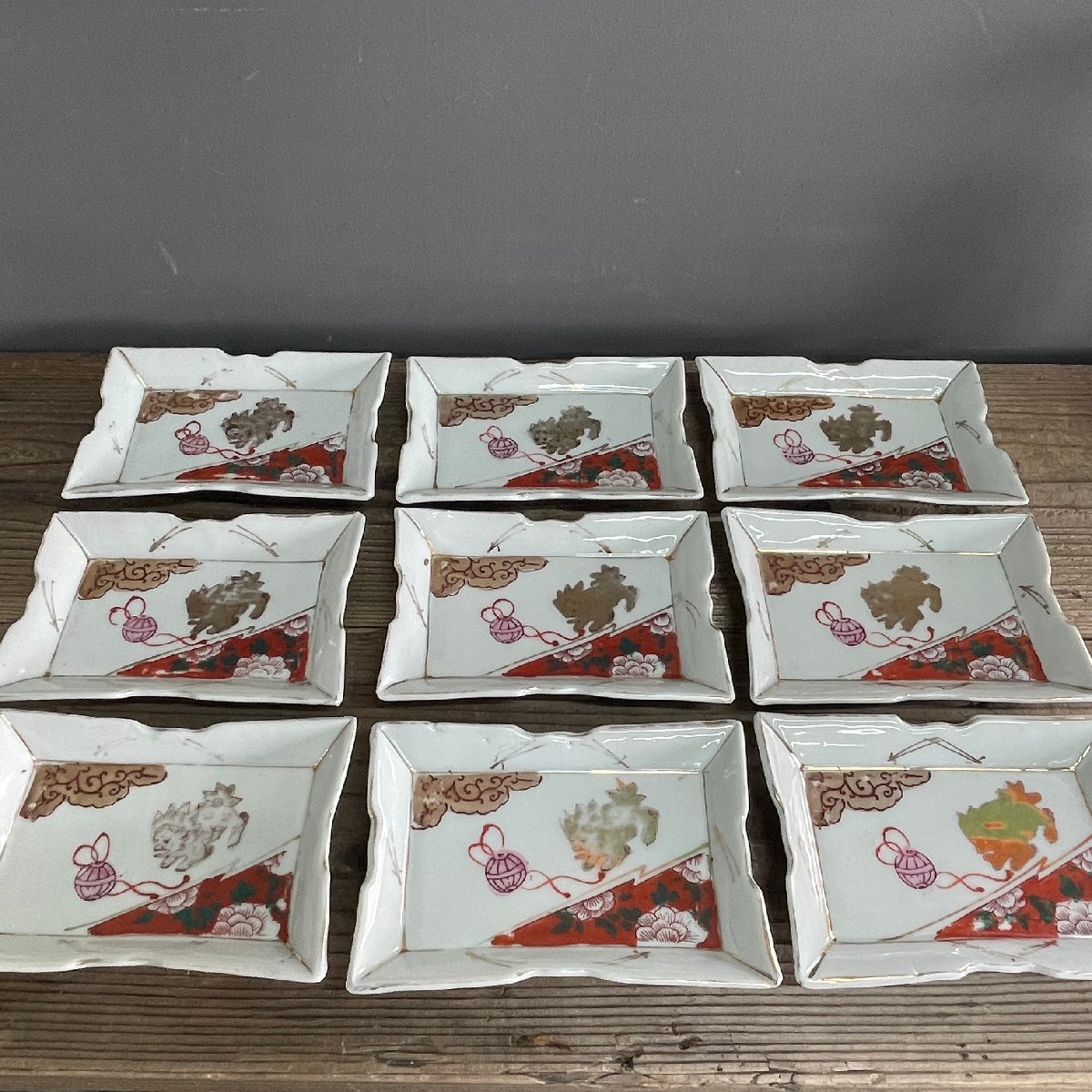 骨董品 ヴィンテージ 絵皿 角皿 さしみ皿 お皿 お祝い 金彩 獅子 鞠 色落ち 1枚欠けあり 9枚