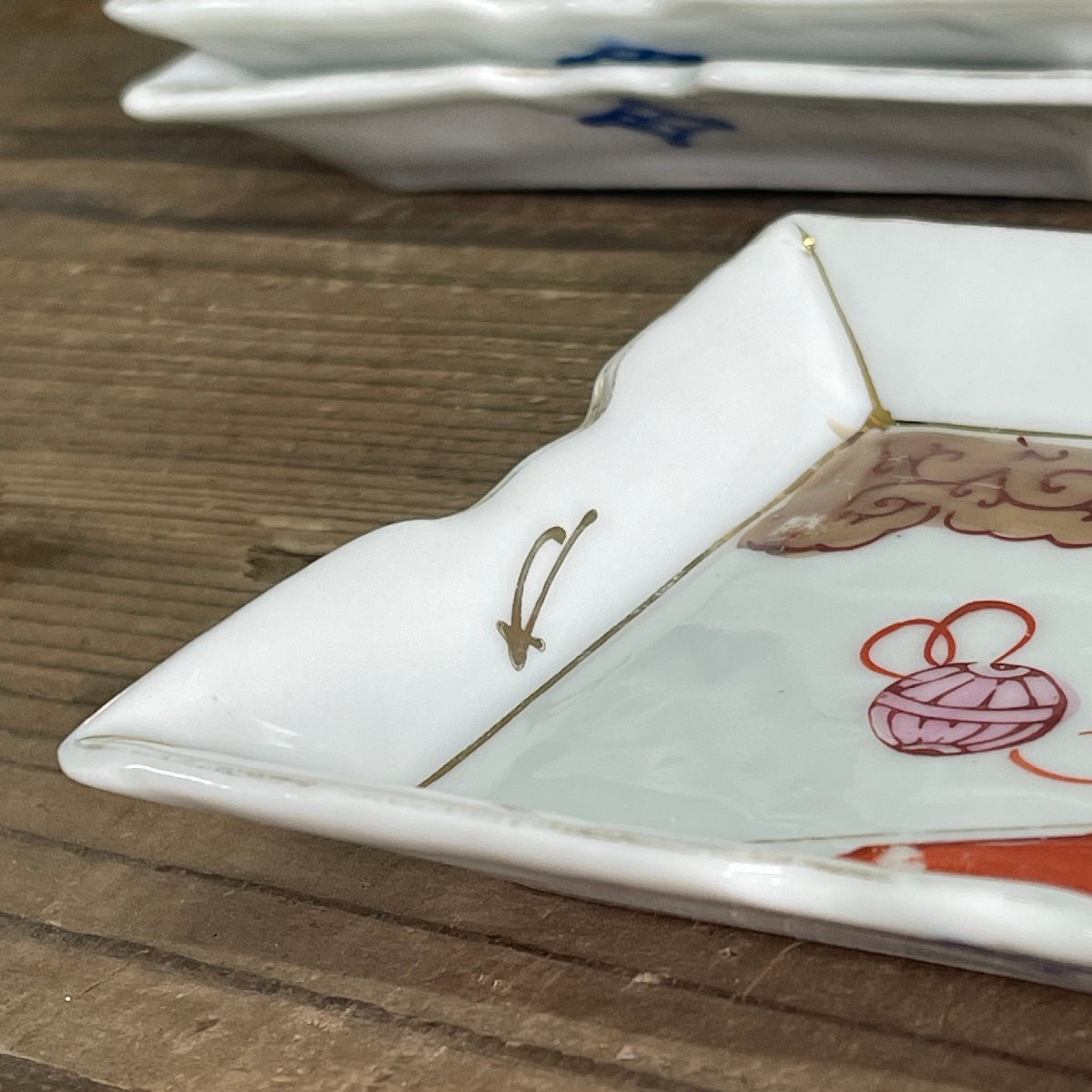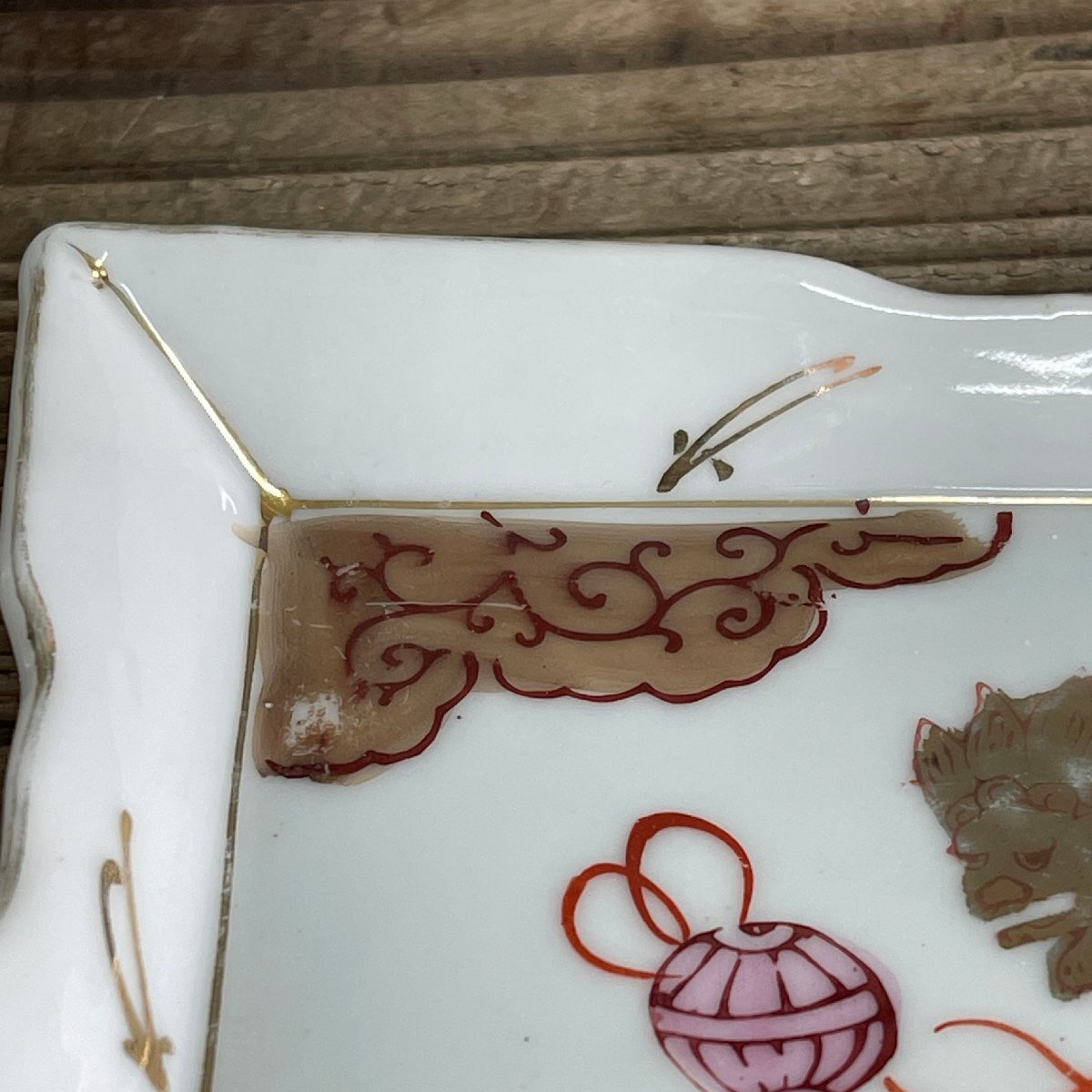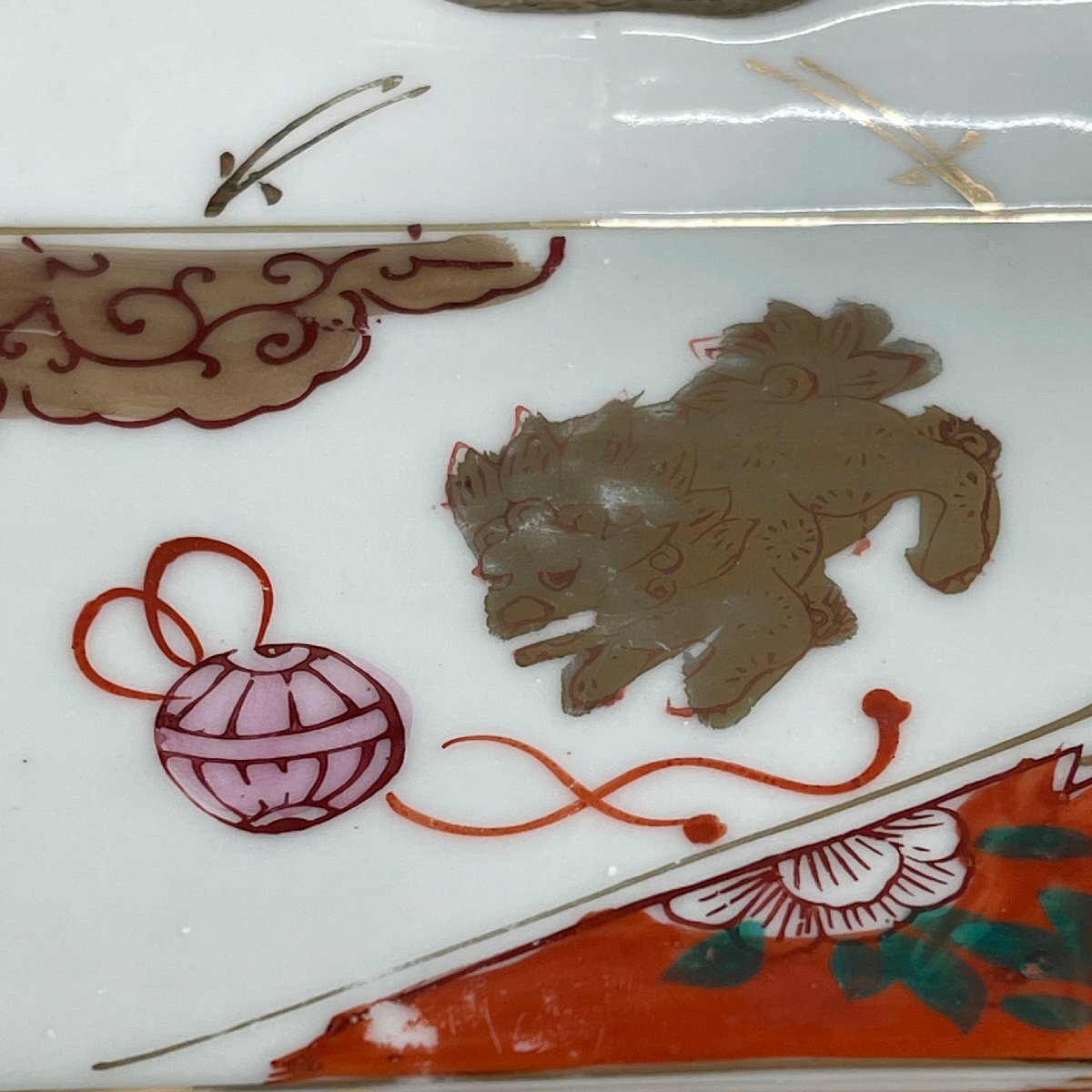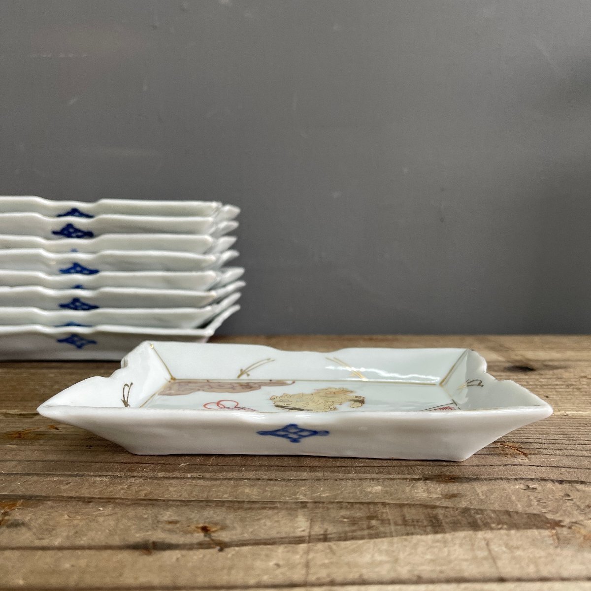 骨董品 ヴィンテージ 絵皿 角皿 さしみ皿 お皿 お祝い 金彩 獅子 鞠 色落ち 1枚欠けあり 9枚
