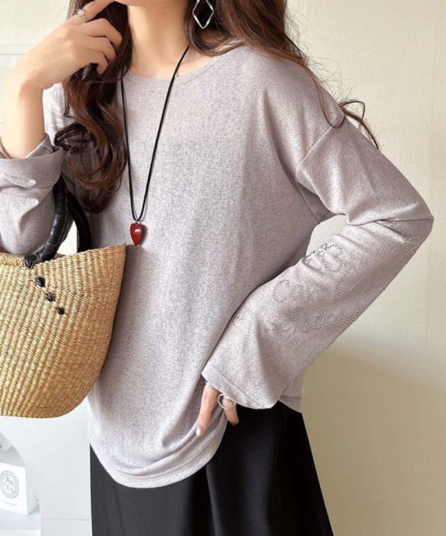 きらめきを纏う。ロゴとフラワーモチーフ袖ラインストーン付きシアー長袖トップ(フレアスリーブ)