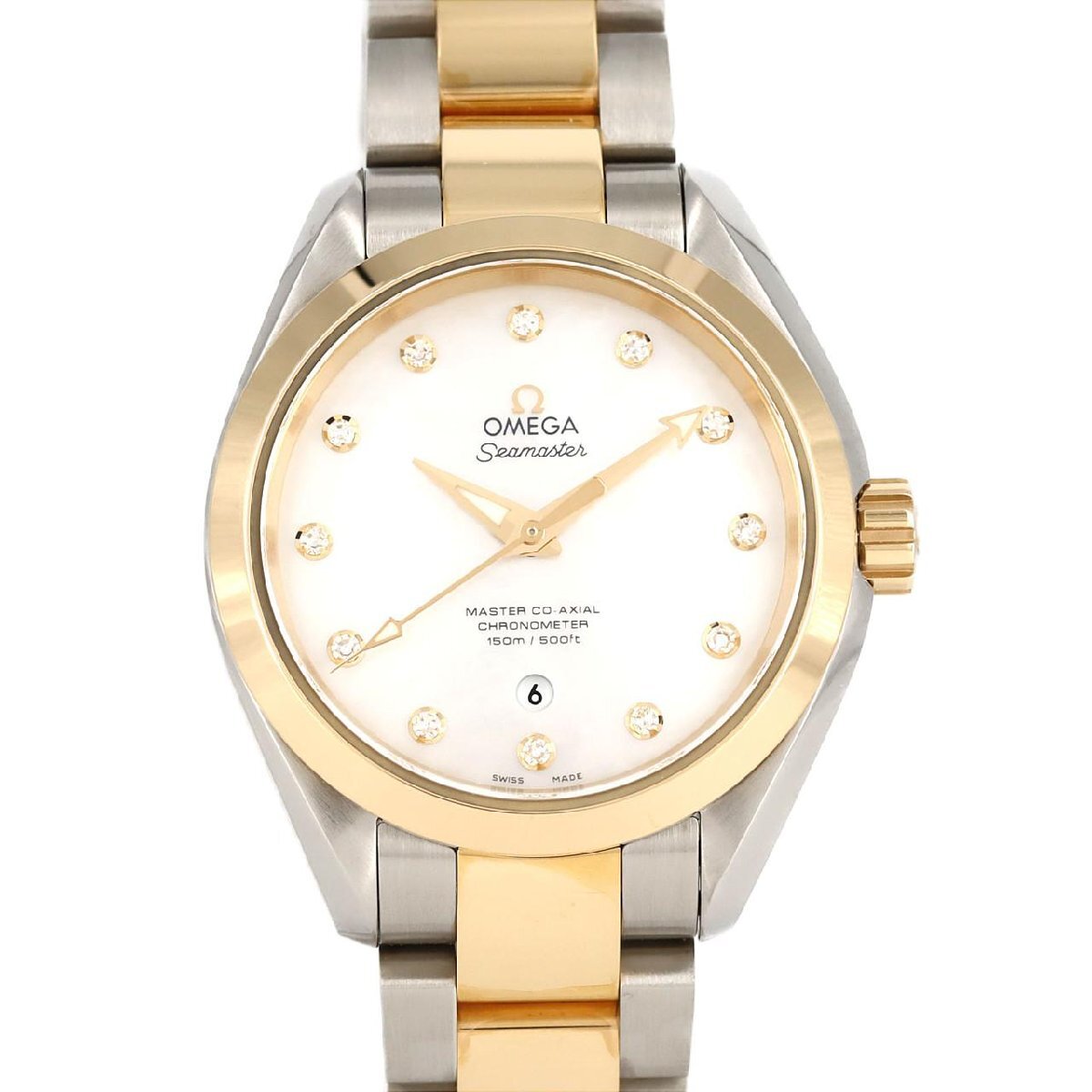 オメガのラグジュアリースポーツウォッチ「シーマスター アクアテラ 150M」。当モデル(Ref. 231.20.34.20.55.002)は、ステンレススチールと18Kイエローゴールドを組み合わせた、華やかなコンビネーション仕様のレディースウォッチです。手首に程よい34mmケースに、ホワイトマザーオブパールのダイヤルをセット。インデックスには11ポイントのダイヤモンドが輝き、3時位置に日付表示を備えています。ムーブメントには、高精度な自動巻コーアクシャルキャリバー「Cal.8520」を搭載。スポーティーさとエレガンスを兼ね備えた一本です。