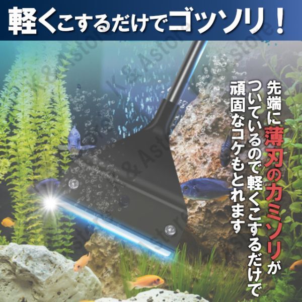水槽のガラス面についた頑固なコケを綺麗に掃除ができる苔取り用スクレーパーです。