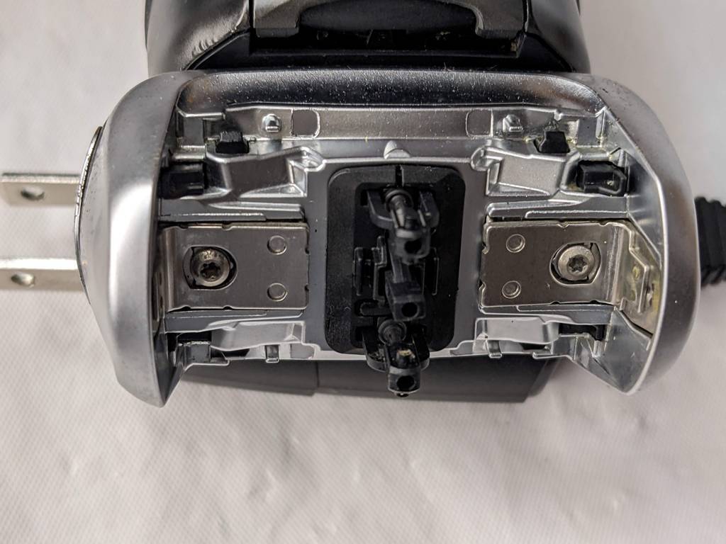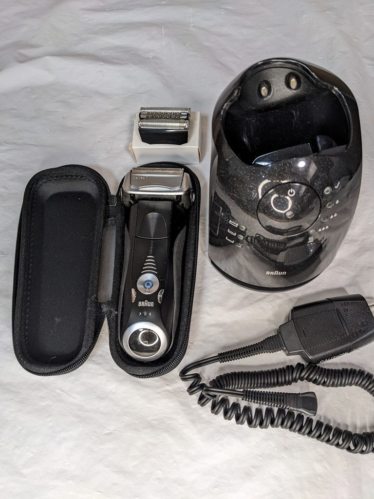 本体、ACアダプター本体、ケース、社外品未使用替刃、使用済み純正替刃、洗浄機