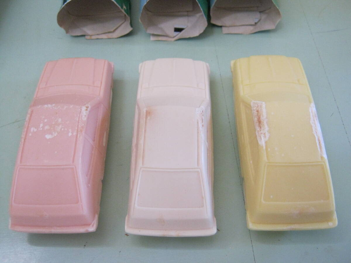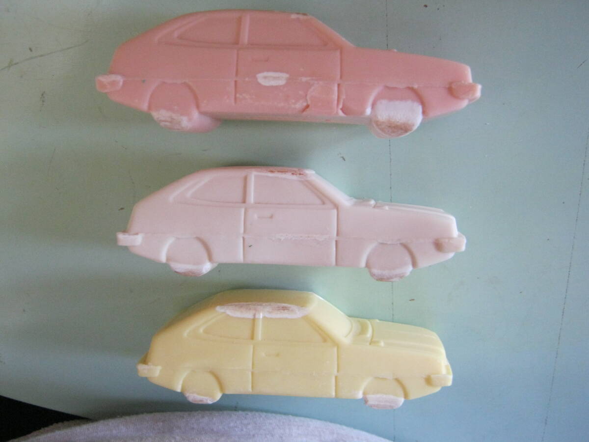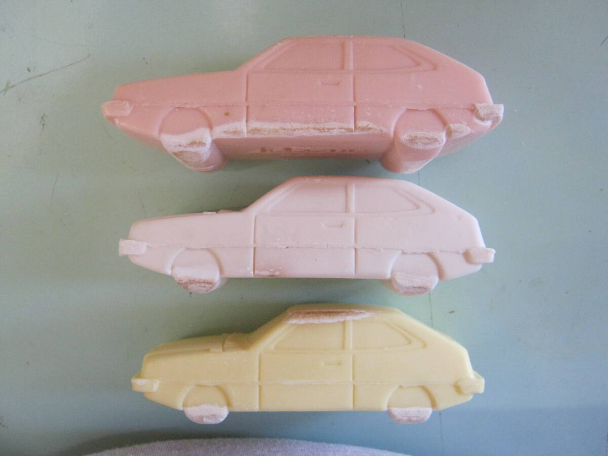 当時物です。エメロン化粧石鹸 初代アコード車型石鹸です。3色3個セットです。色はピンク・ホワイト・イエローの3色です。各、車型石鹸は未使用品ですが約49年経過した物です。状態確認と撮影の為それぞれのパッケージから車型石鹸を出して撮影しました。各、車型石鹸の状態はワレ、欠けはありませんが劣化の為部分的に白く変色している部分があります。ピンクの車型石鹸に製造不良があります。