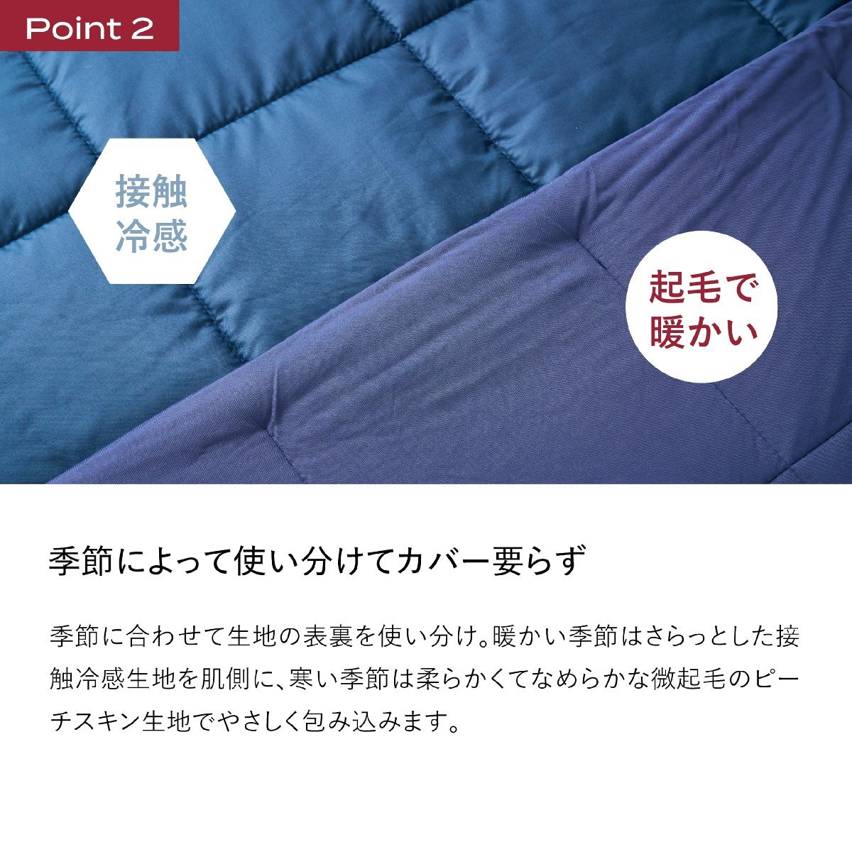 季節に合わせて生地の表裏を使い分け。暖かい季節はさらっとした接触冷感生地を肌側に、寒い季節は柔らかくてなめらかなピーチスキン生地でやさしく包み込みます。カバーをかけずにご使用ください。