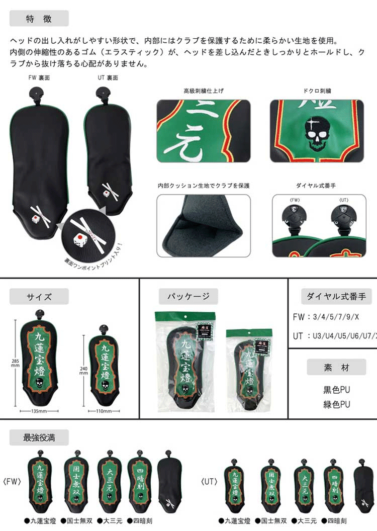 【商品特徴】 麻雀のヘッドカバーシリーズで「役満柄」ユーティリティ用をランナップ。 上質なPU使いで、大切なクラブを傷から守り、目立つデザインで注目度がアップすること間違いなしです。 ヘッドの出し入れがしやすい形状で、内部にはクラブを保護するために柔らかい生地を使用。 宇井川の伸縮性のあるゴム(エラスティック)が、ヘッドを差し込んだときしっかりとホールドし、クラブから抜け落ちる心配がありません。 ■裏面番手刺繍入り ・ワンポイントプリント入り ■高級刺繍仕上げ ・ドクロ刺繍 ■内部クッション生地でクラブを保護 ■ダイヤル式番手表示(U3/U4/U5/U6/U7/X) 【商品詳細】 ●状態:新品・未使用品 ●サイズ:240mm×110mm ●素材:PU ※撮影時の光量の具合や、ご覧いただいております画面環境によりまして、実際の商品と若干色味が違う場合がございます。