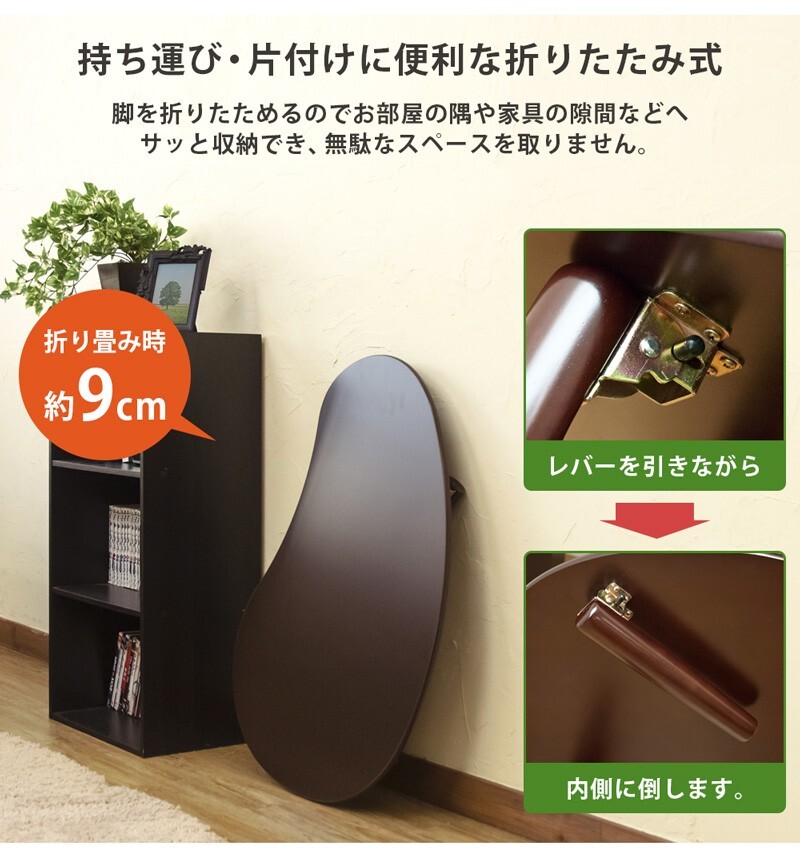 | サイズ | (W)幅85×(D)奥行55×(H)高さ32cm 天板の厚さ:約15mm 脚の太さ:約48mmφ 折り畳み時の厚さ:約90mm |